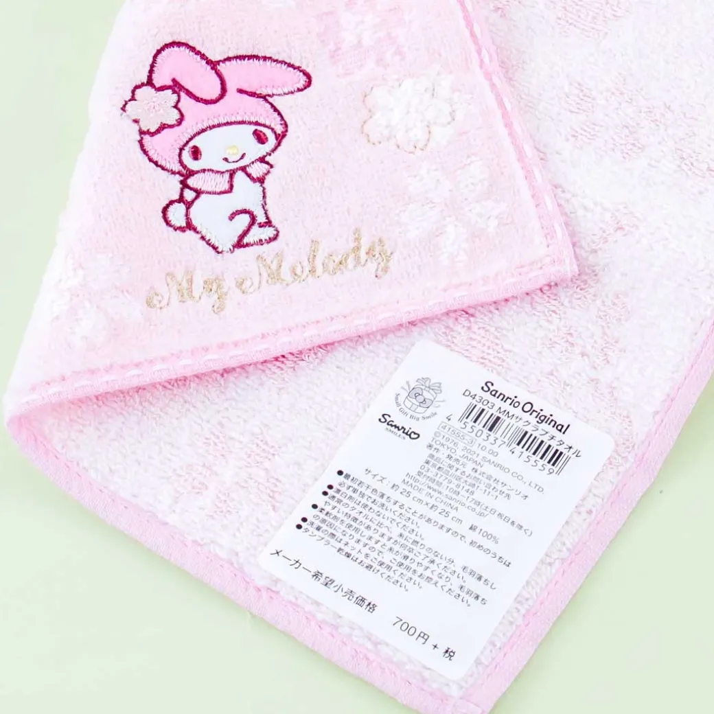 - A hand towel with embroidery featuring My Melody and sakura flowers