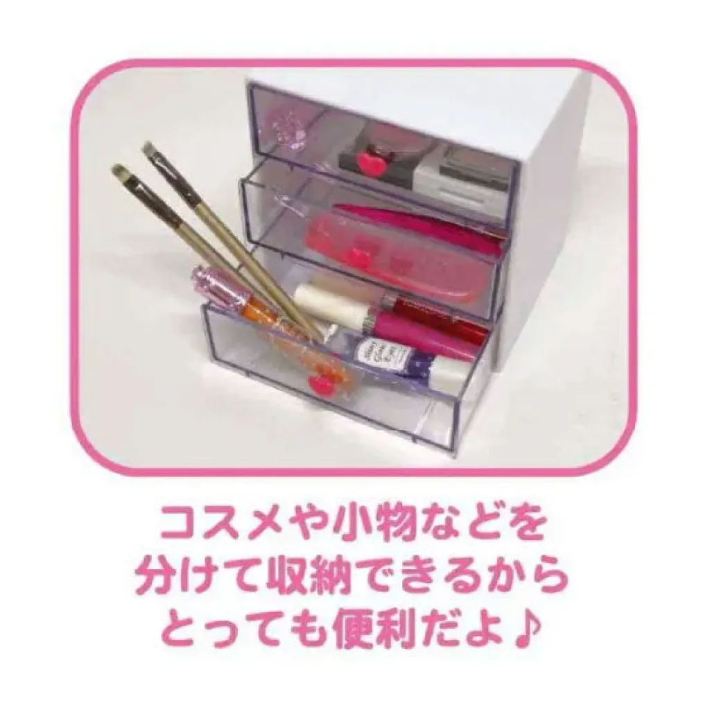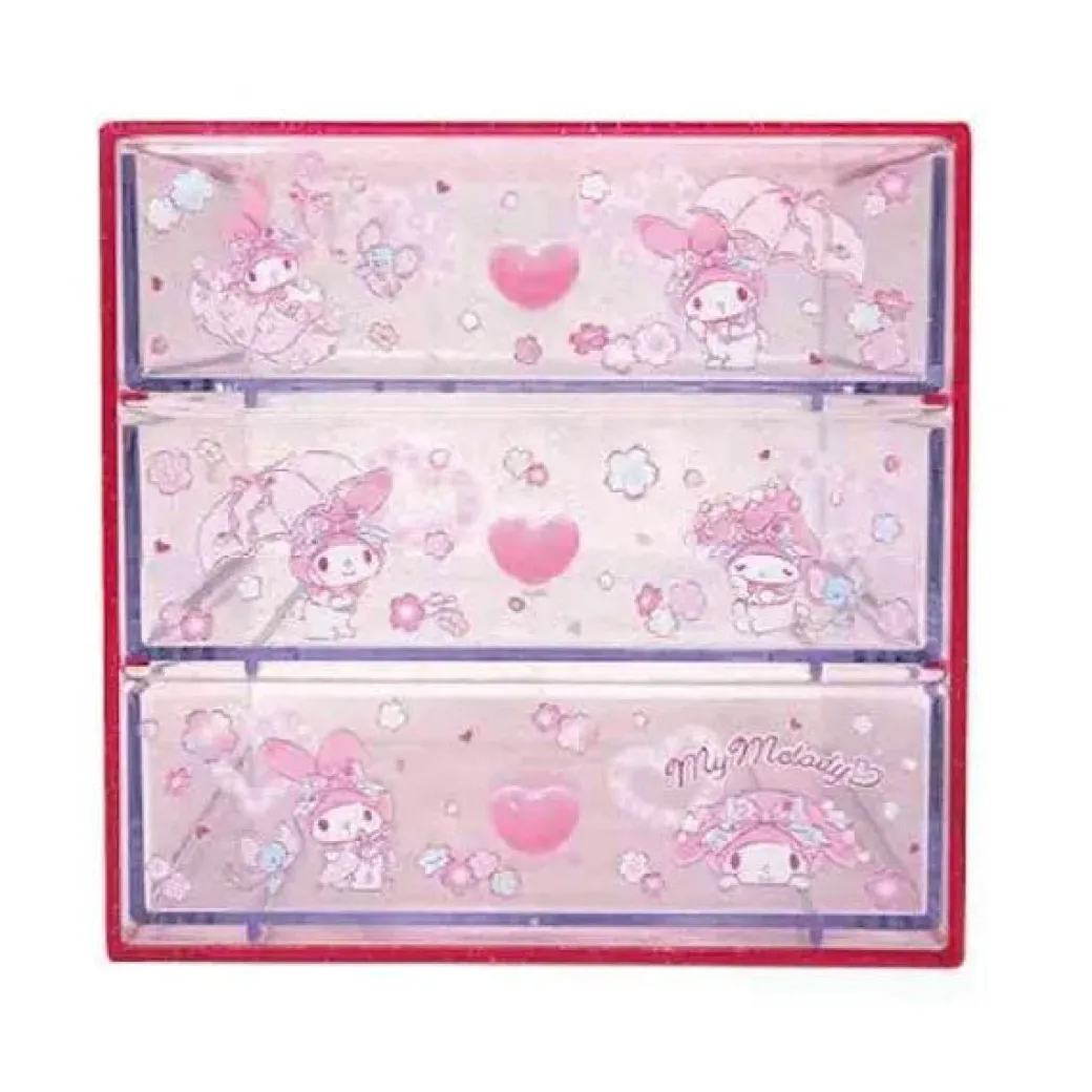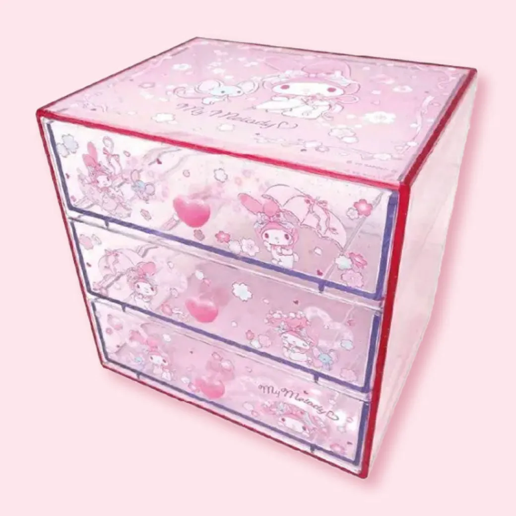 This mini drawer chest features illustrations of My Melody with a kawaii sakura design. It has three transparent, glittery drawers and heart-shaped knobs. The compact size is perfect for organizing small items while adding a dose of cuteness to your desk!