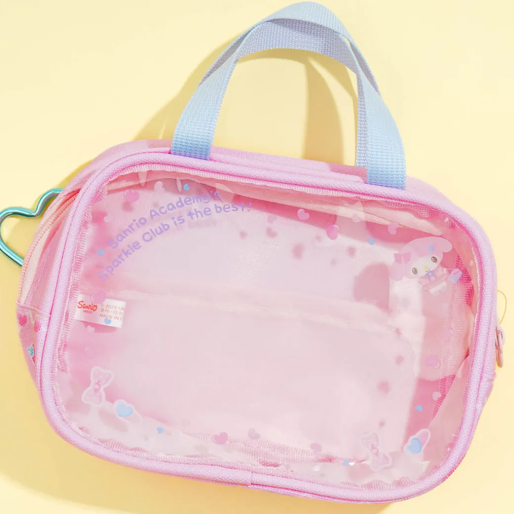 This kawaii handbag from the Sanrio Academy series features cute prints of My Melody, ribbons, and hearts! It’s also decorated with a fluffy, ribbon-shaped charm. The back part is clear so you can easily see what’s inside.