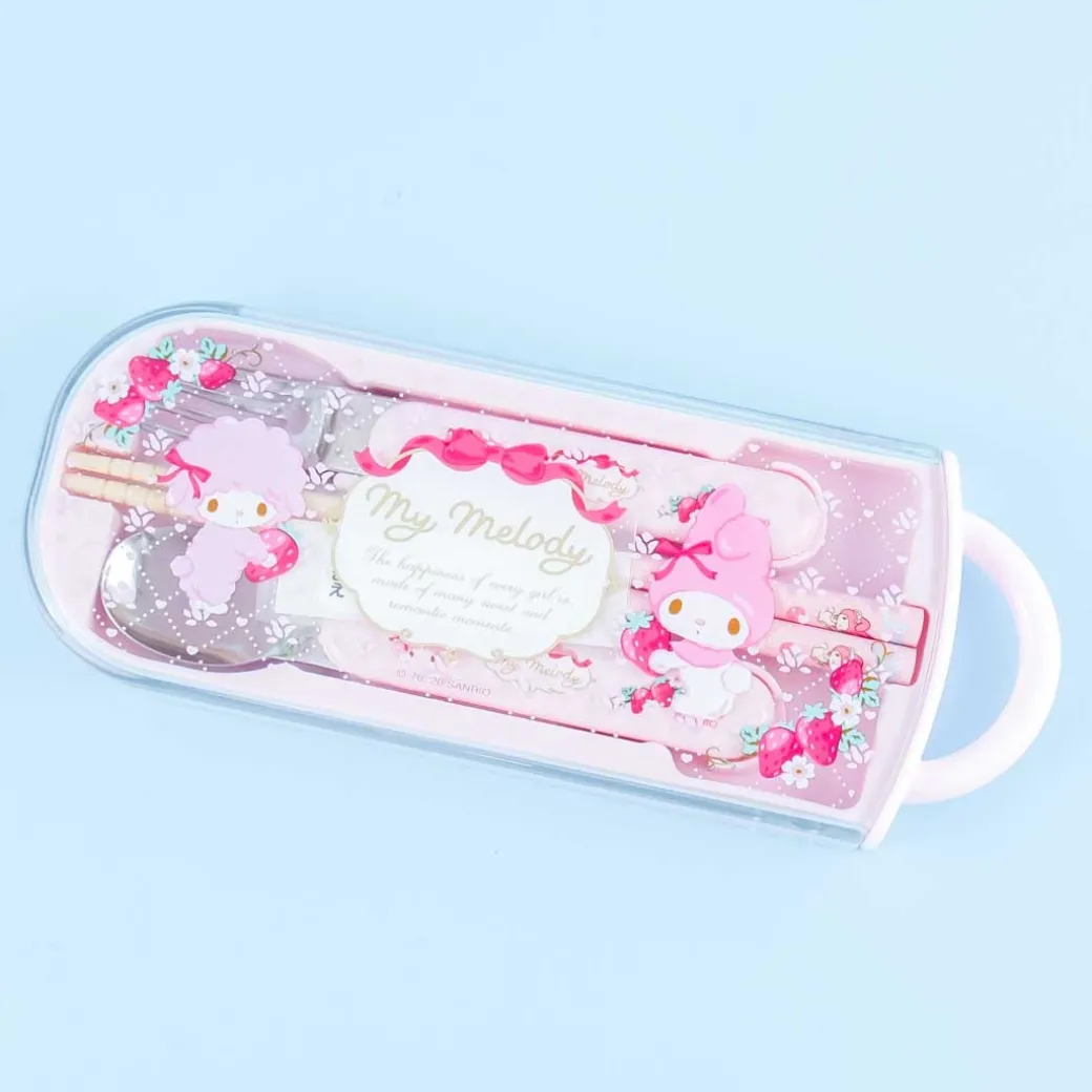 - A cutlery set featuring My Melody and My Sweet Piano picking strawberries