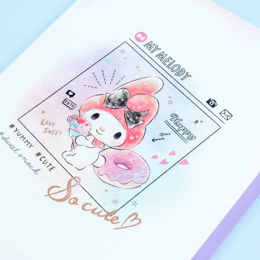 - A softbound notebook featuring My Melody and café food