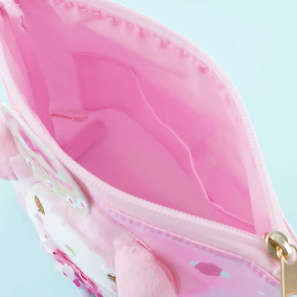 - A kawaii zippered pouch with prints of roses and has a pop-out My Melody embroidery