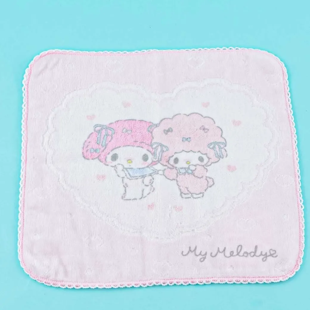 - A super kawaii mini towel illustrated with My Melody and My Sweet Piano holding hands