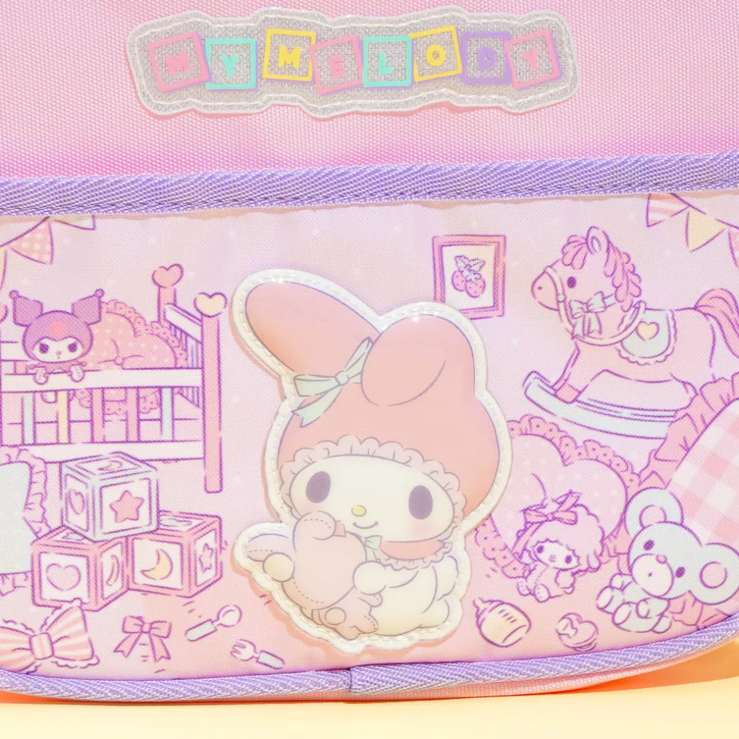 This super cute shoulder bag featuring a toddler My Melody and her bedroom is perfect for your school stuff! It has a small outer pocket, an adjustable shoulder strap, and a double-zipper closure. There’s even a name tag inside!
