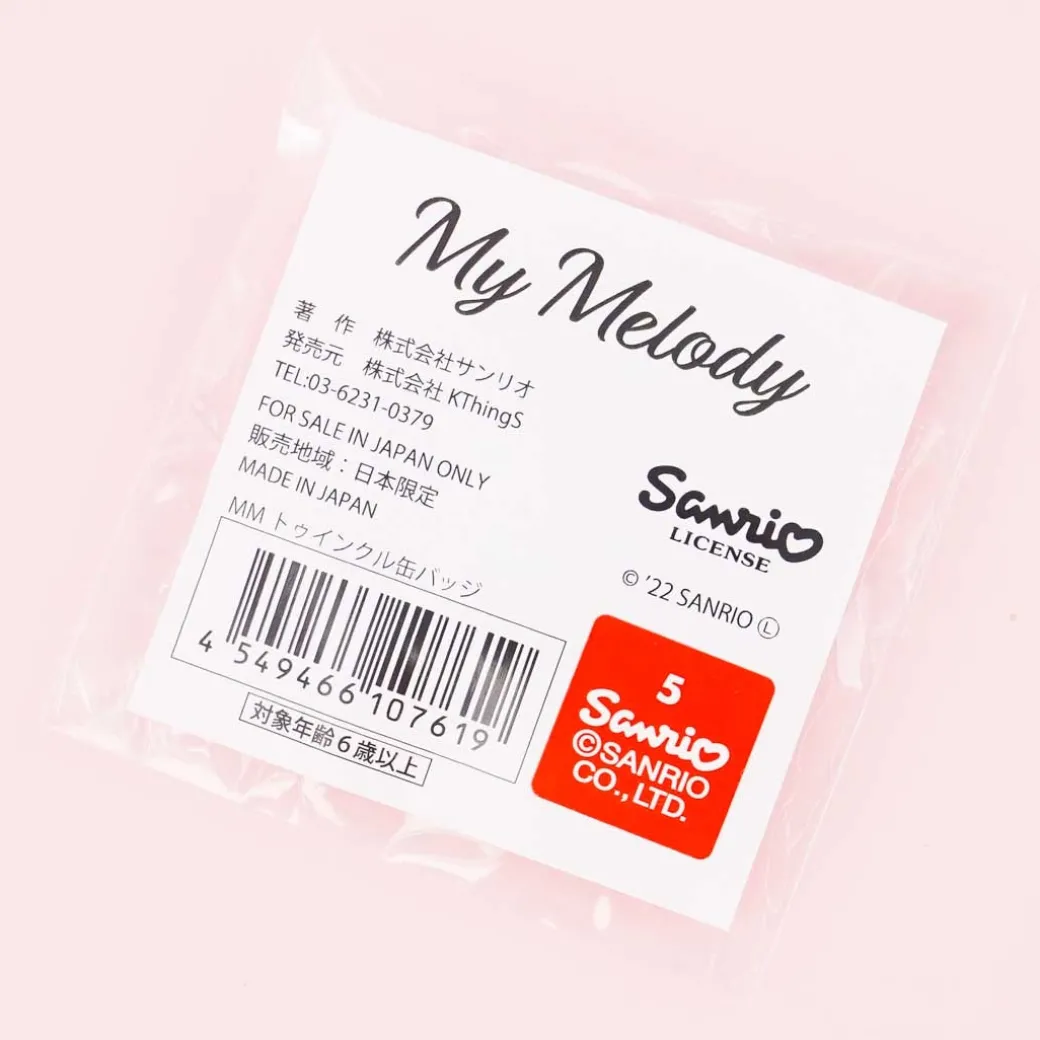 - A cute badge illustrated with My Melody carrying flowers in a lovely dress