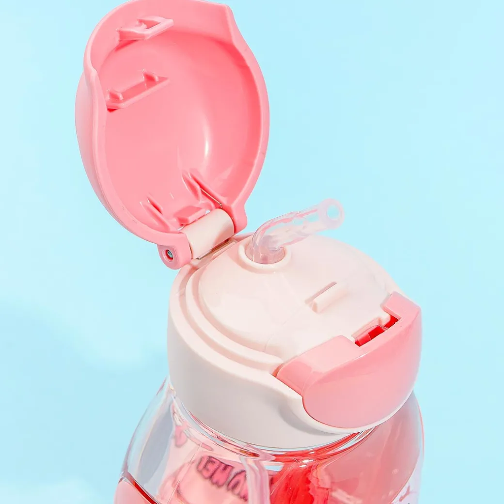Bring your favorite drink using this super cute bottle featuring illustrations of My Melody and her friend Flat from the “Ushiro Shiro” series. This bottle has a unique oval shape, a drinking straw, and a one-push lid so kids can easily use it! It also comes with a cute adjustable shoulder strap covered with prints of My Melody.