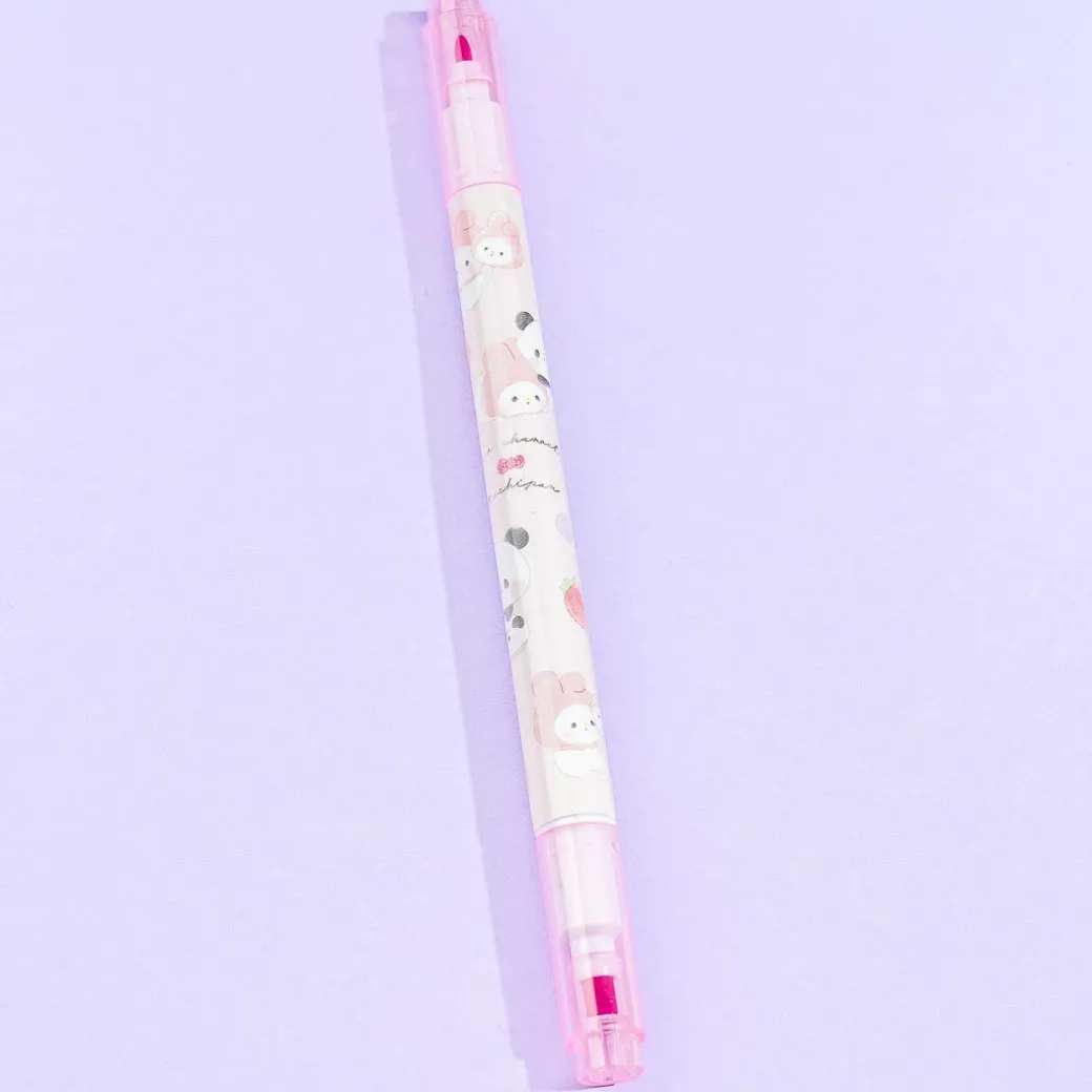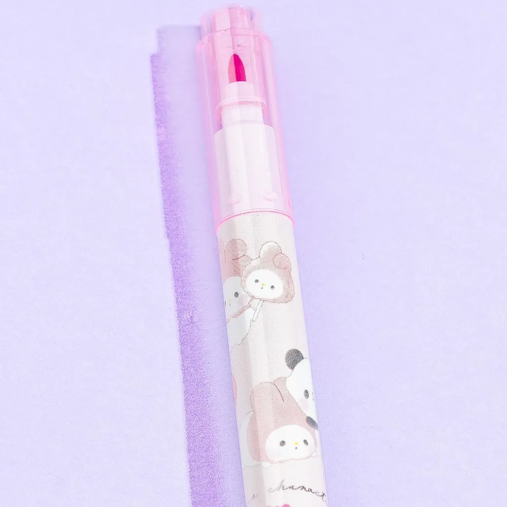This cute twin marker showcases Mochi Mochi Panda playing around with My Melody. Use it to practice your calligraphy! It has a medium tip and a flat tip so you can create different kinds of text.
