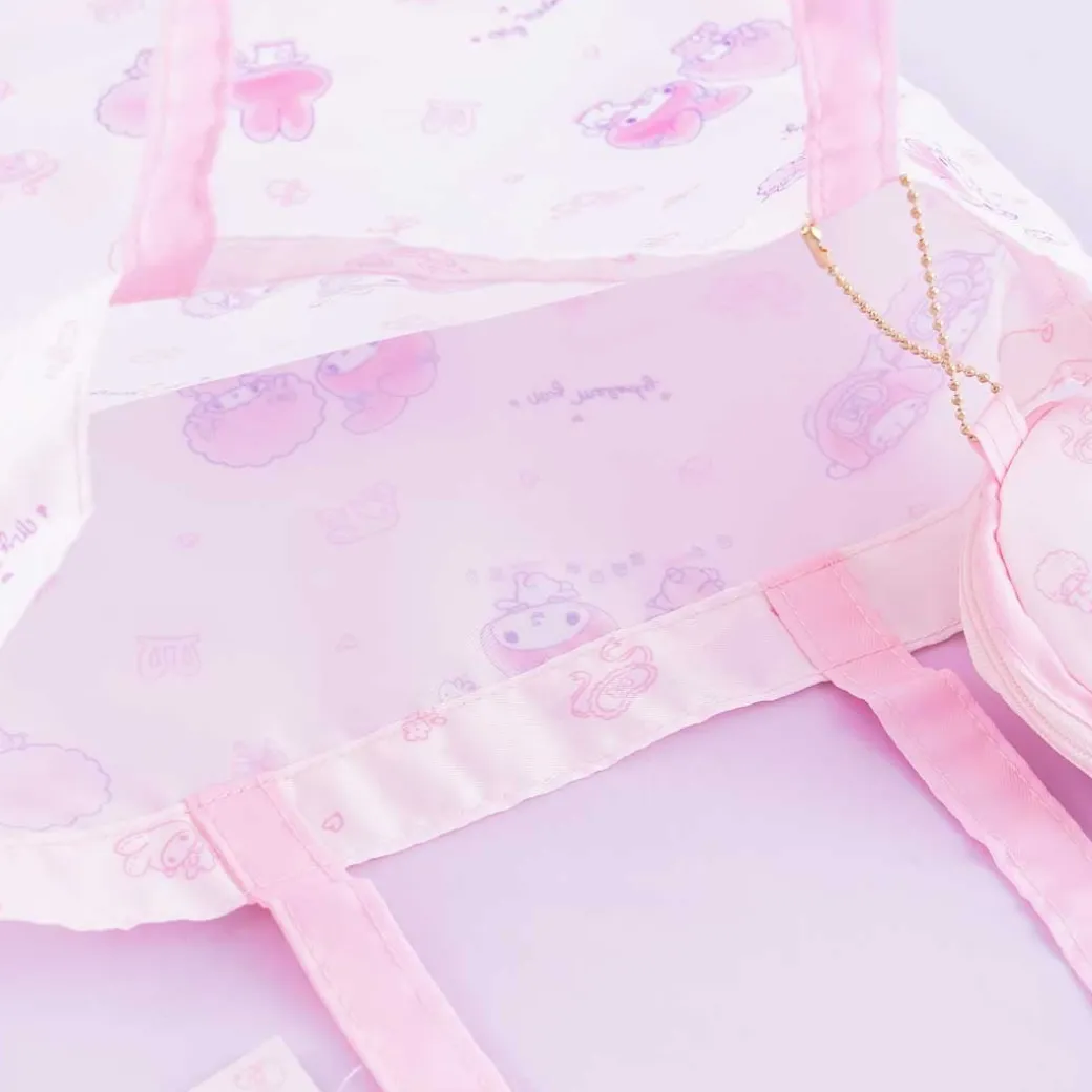 - A kawaii eco bag covered in prints of My Melody and My Sweet Piano