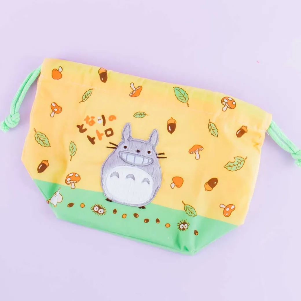 - A kawaii drawstring lunch bag featuring Totoro with falling chestnuts and mushrooms