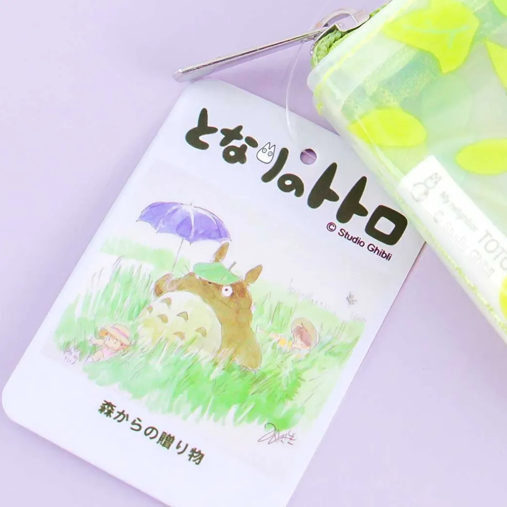 - A zippered pencil case featuring soot sprites from My Neighbor Totoro and leaves