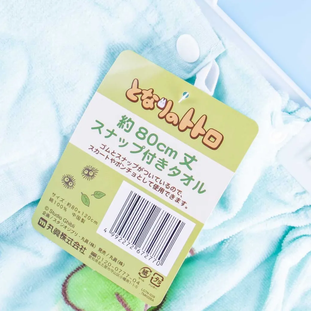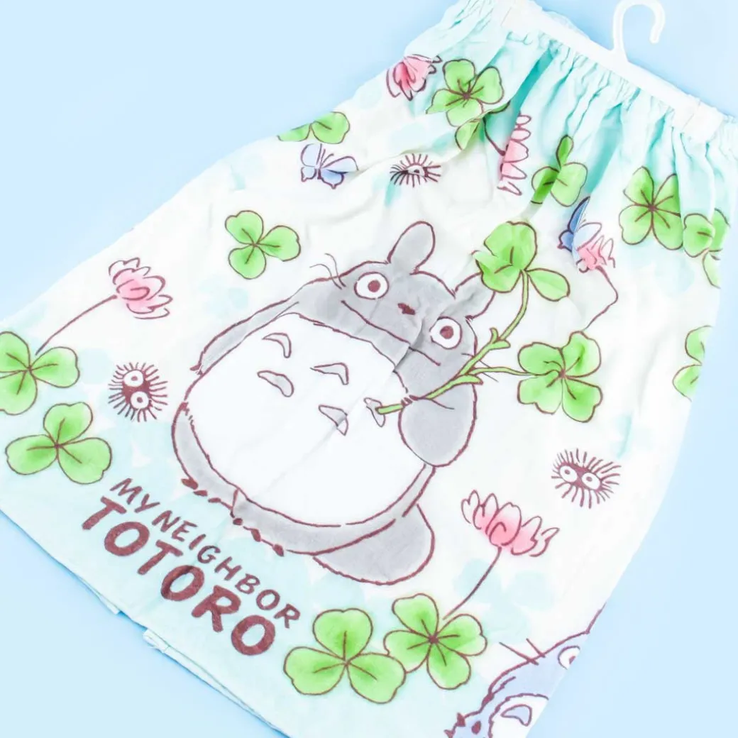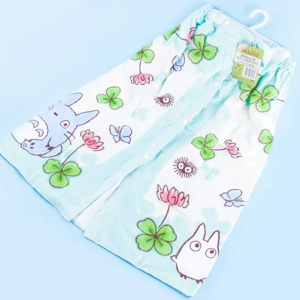 - A bath towel that can be used as a cover-up featuring Totoro, soot sprites, and clovers