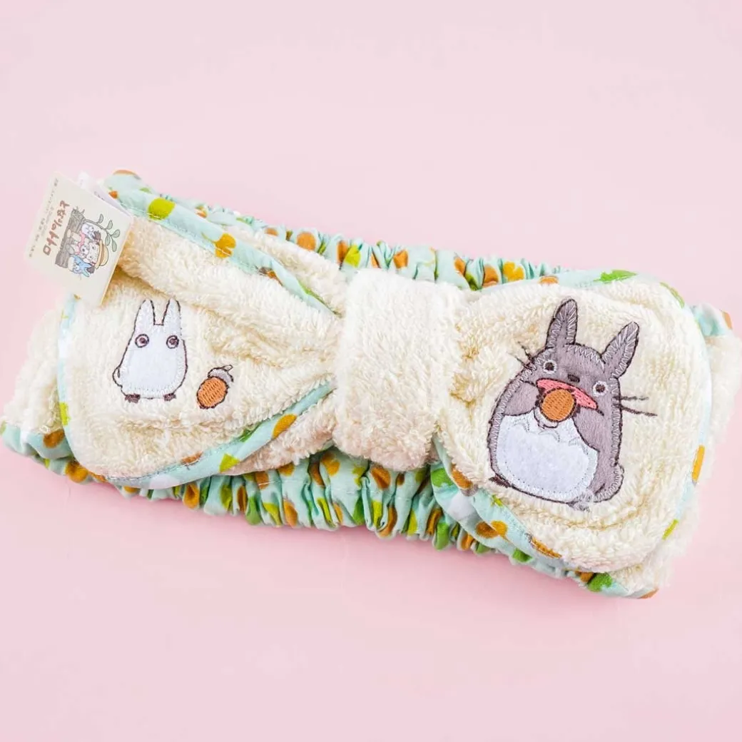 - A kawaii headband with chestnut patterns that has a fluffy bow with prints of Totoro and Chibi-Totoro