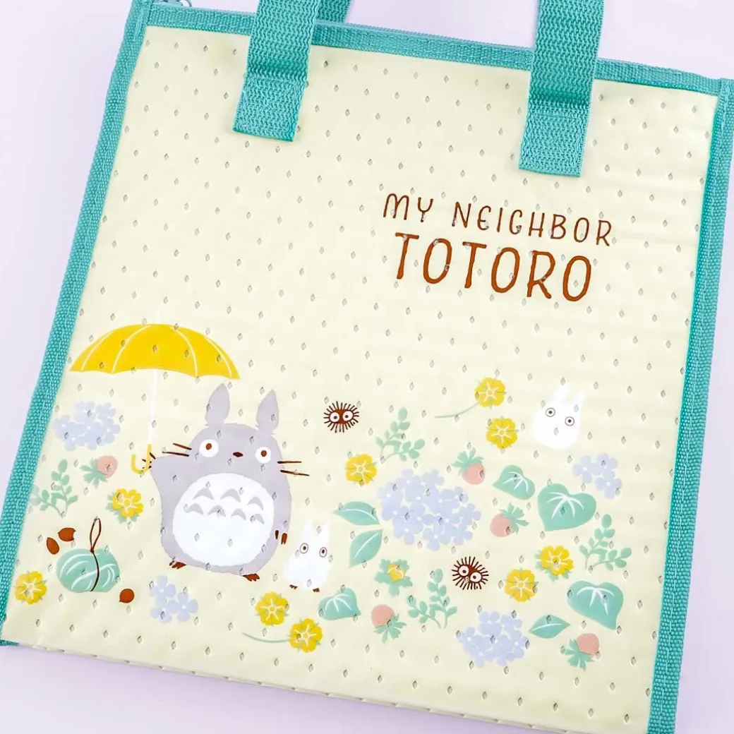 - A kawaii lunch bag with illustrations of Totoro, Chibi-Totoro, and soot sprites