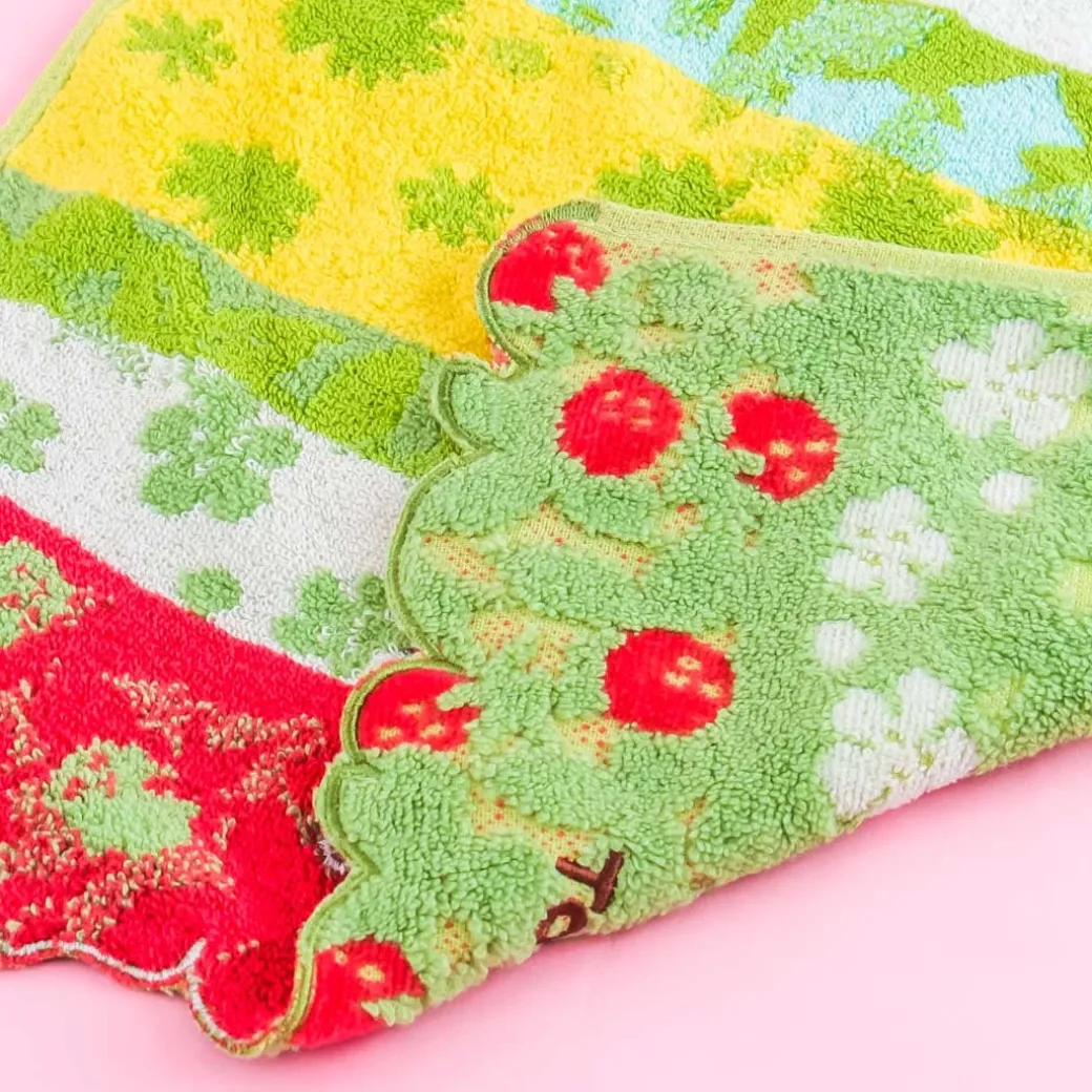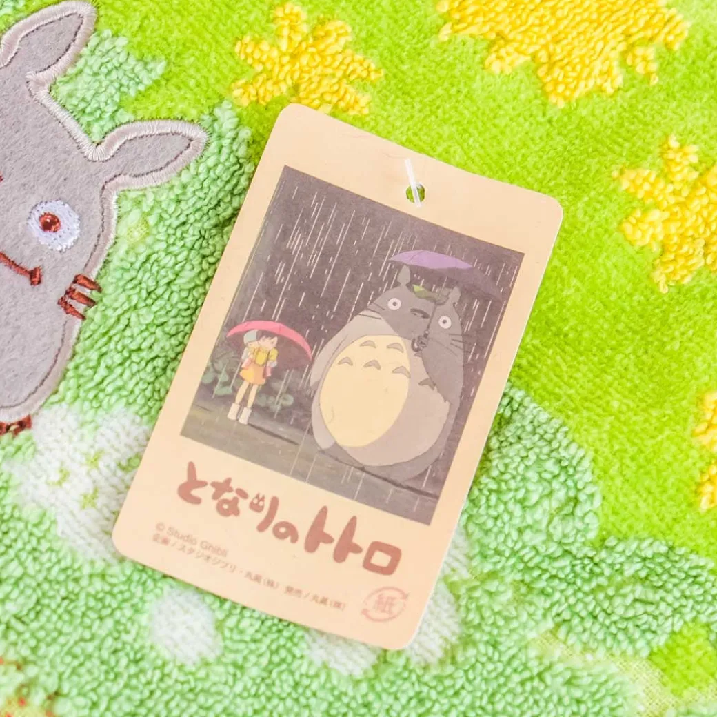 - A hand towel featuring an embroidery of Totoro, strawberries, and flowers from My Neighbor Totoro