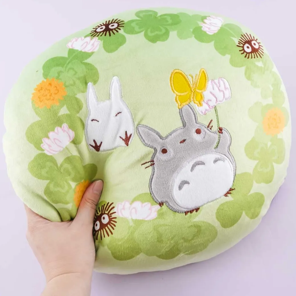 - A cute cushion featuring prints of My Neighbor Totoro characters in a verdant garden