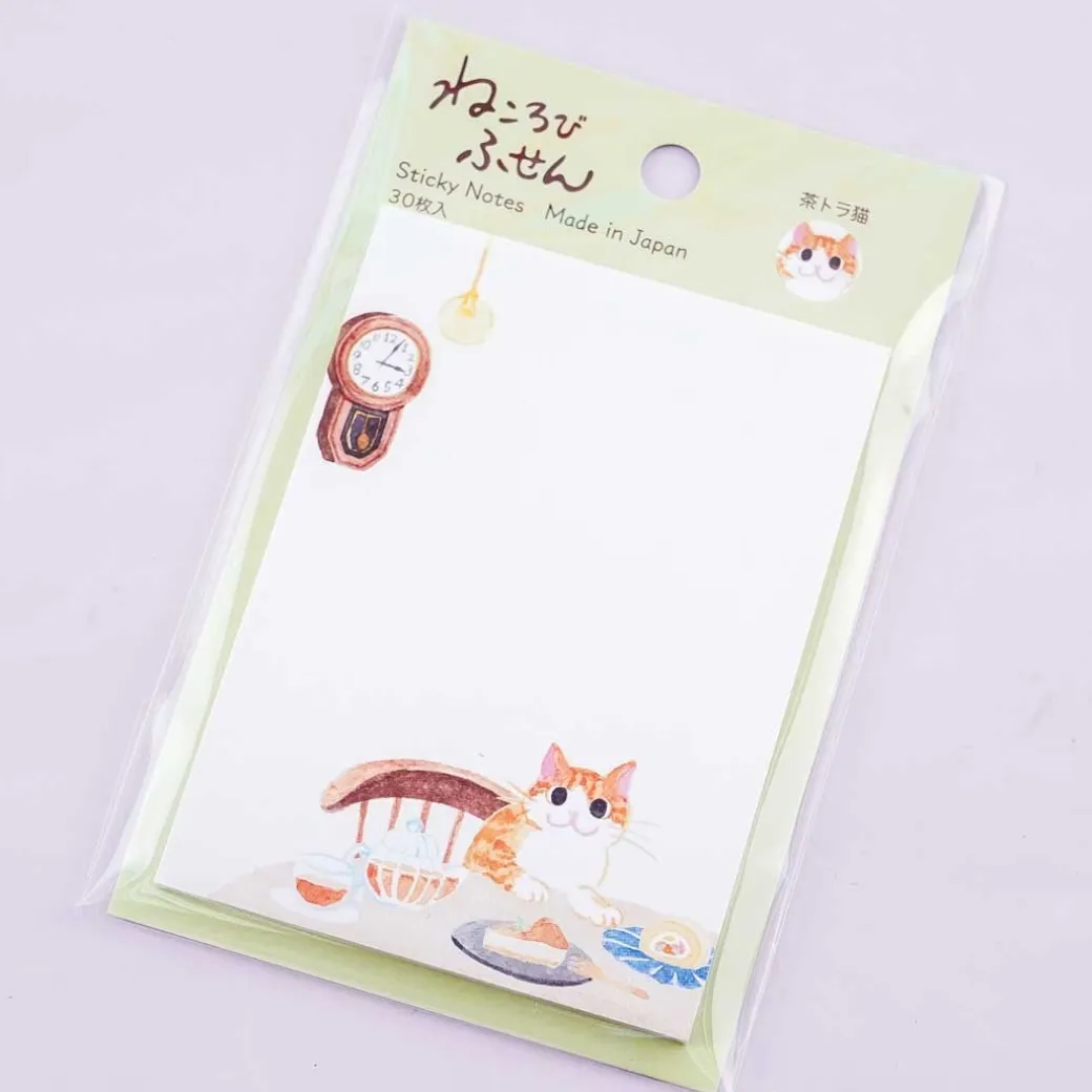 - A super kawaii pad of sticky notes featuring prints of a cat having a snack