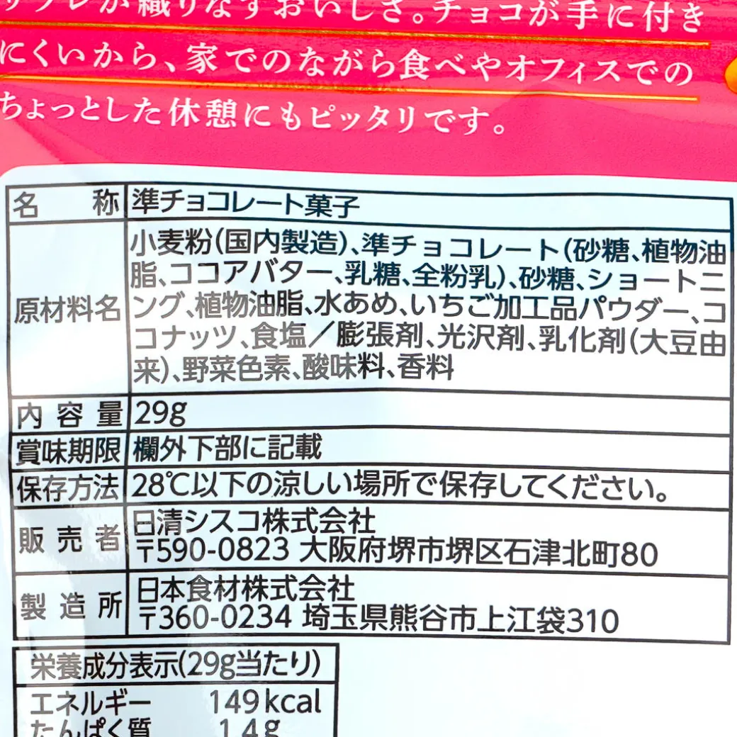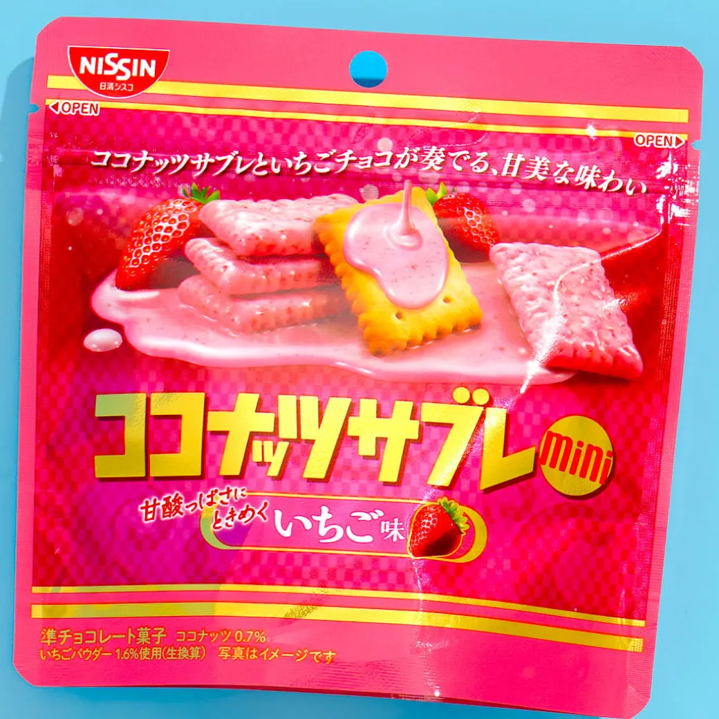 Enjoy this bite-sized version of Nissin’s Coconut Sable biscuits! It’s coated with delicious strawberry-flavored chocolate. This snack comes in a resealable pouch so you can easily bring it when you travel!