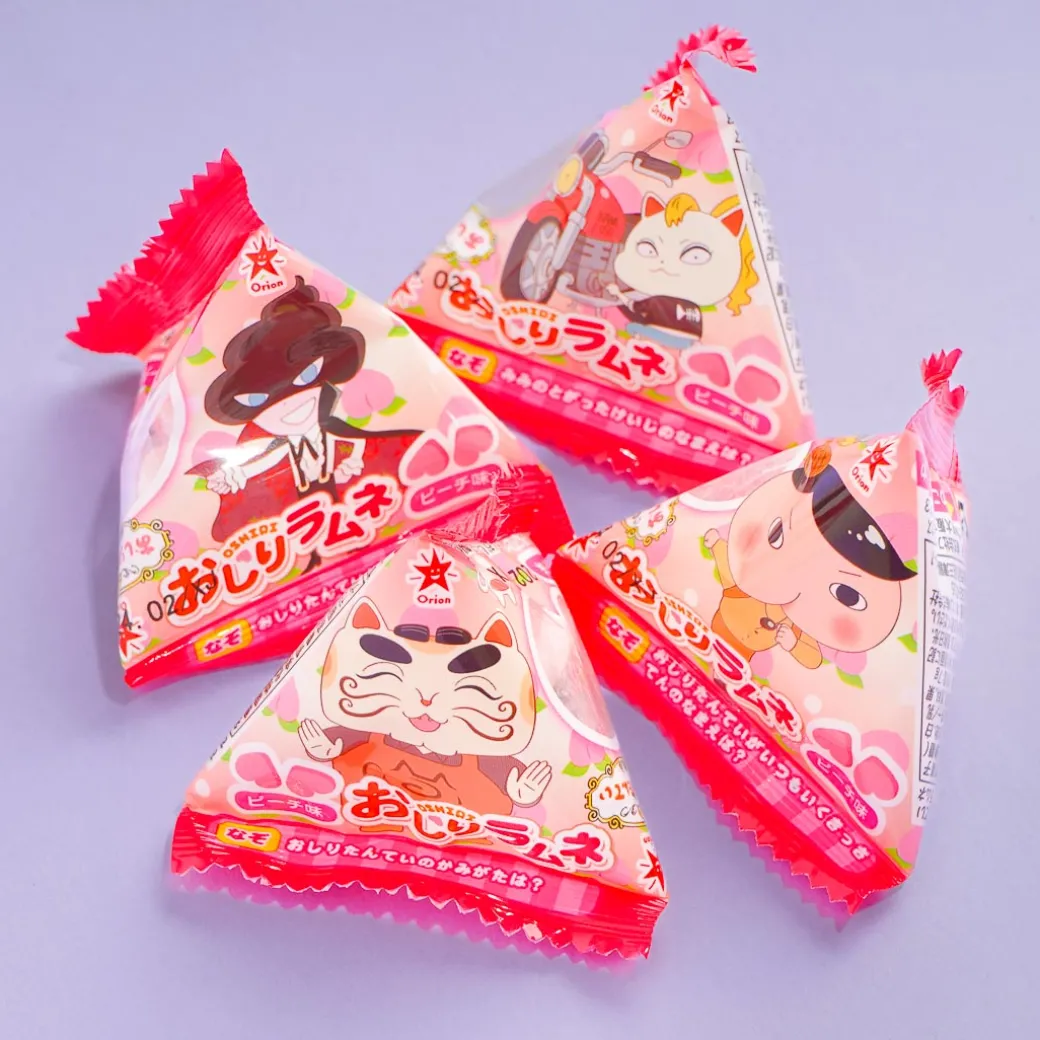 Savor the taste of these kawaii ramune candies! They taste like peaches and are shaped like hearts, perfect for a quick treat. By ordering, you will receive one random package design.