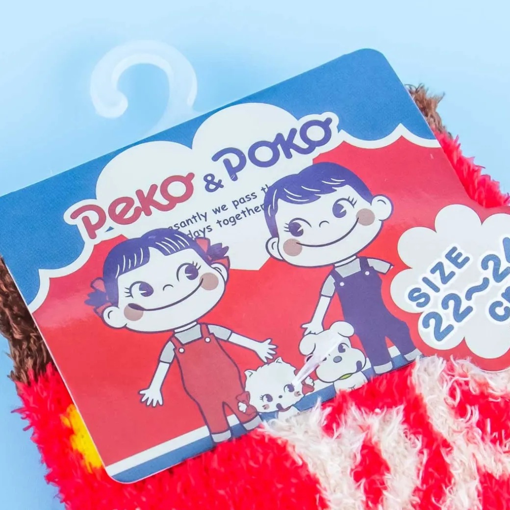 - A kawaii pair of fluffy socks featuring prints of Milky Candy’s Peko-chan smilling