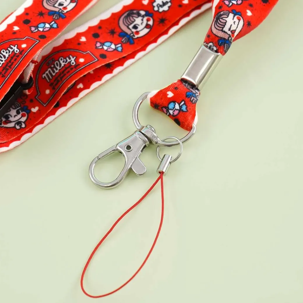 - A super cute lanyard featuring prints of Milky candy mascot Peko-chan making funny faces