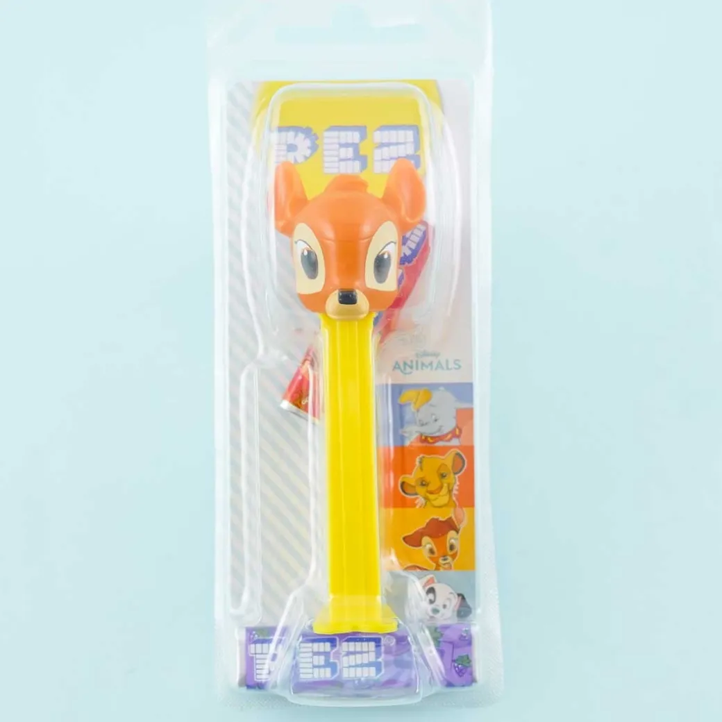- A pack of grape and cola-flavored candy with a PEZ dispenser featuring Bambi
