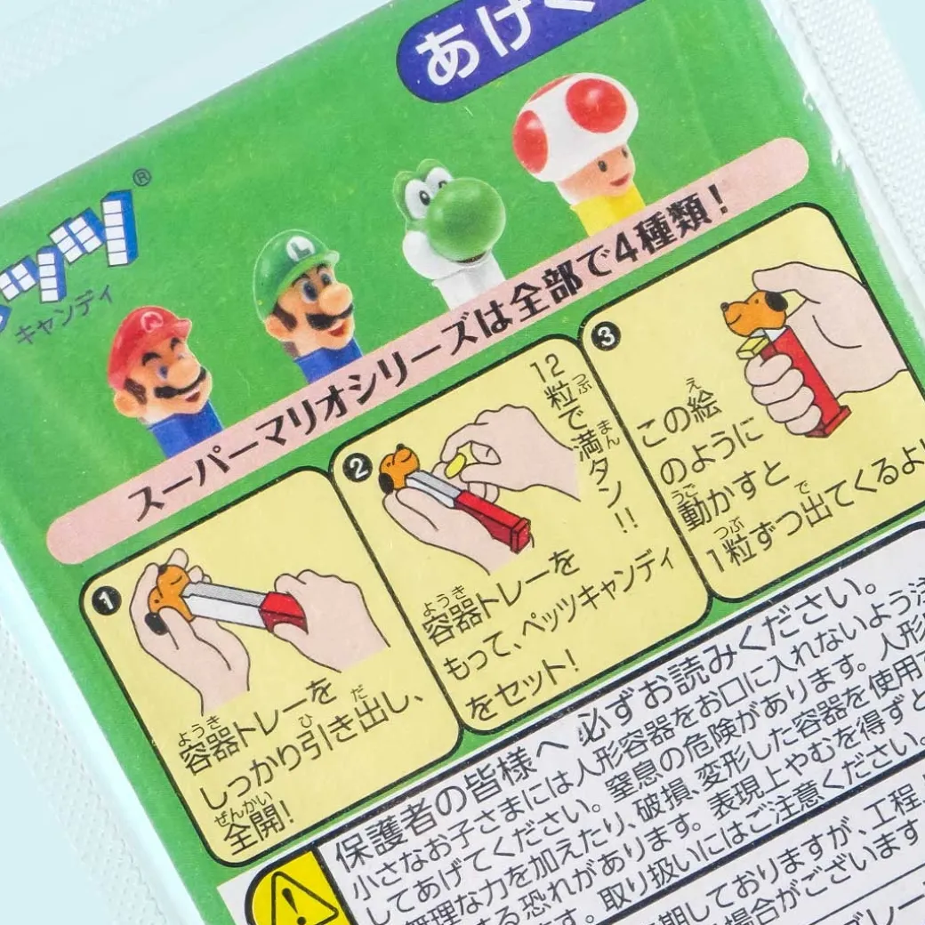 - A pack of grape and cola-flavored candy with a PEZ dispenser featuring Mario from the Super Mario franchise