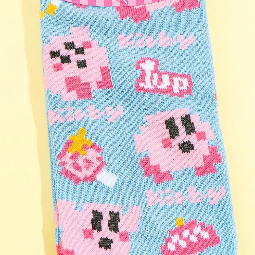 This kawaii pair of socks is decorated with pixelated prints of Kirby! It comes from a collab between Kirby and the artist Makoto Ozu. Wear these jaqcuard socks while hanging out in your gaming room.