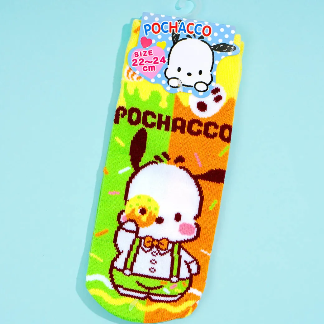Put on this cute pair of socks before wearing your shoes. They showcase prints of Pochacco wearing a fancy outfit while holding up a yummy donut!