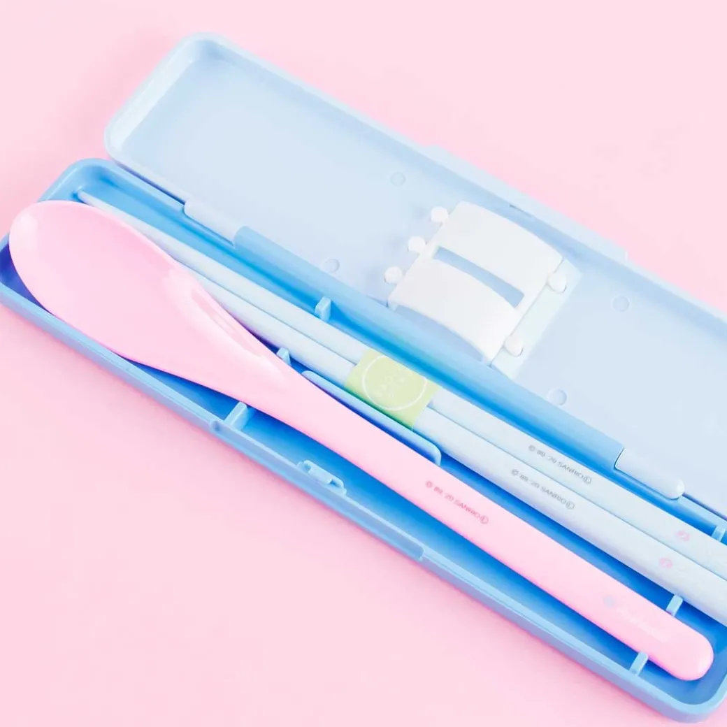 - A kawaii utensil set featuring Pochacco lying down with his friends