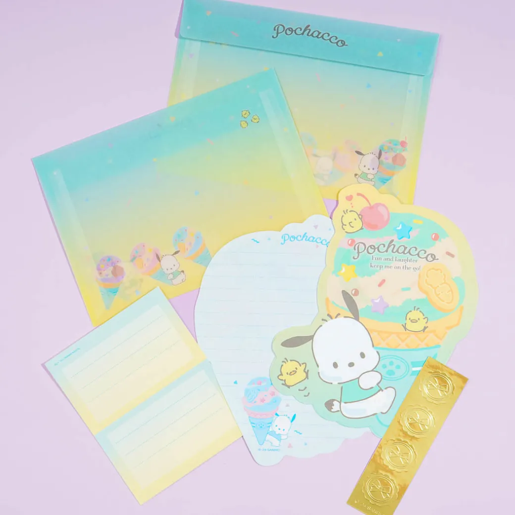 Send sweet messages to the people you love using this super kawaii letter set. It showcases prints of Pochacco hanging on to a giant cone of ice cream! This letter set comes complete with notepaper, seals, envelopes, inner paper, and address stickers.