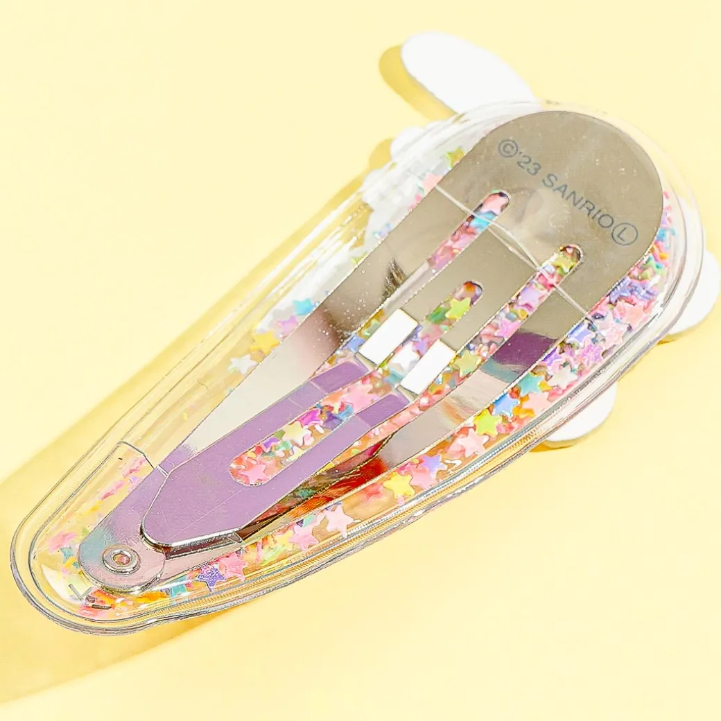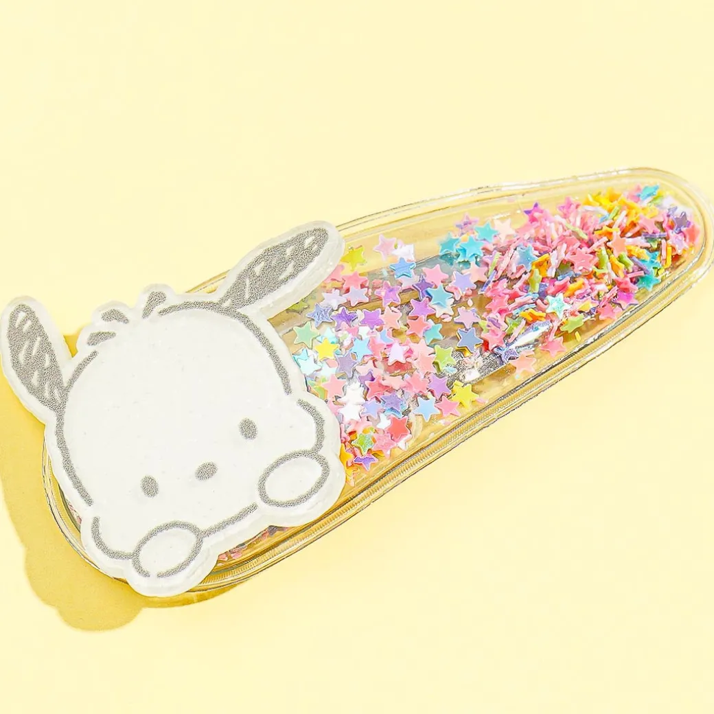 This super kawaii transparent clip is filled with shiny rainbow-colored stars and is decorated with a die-cut Pochacco head charm! Add a dose of cuteness to your look by wearing this hair accessory.