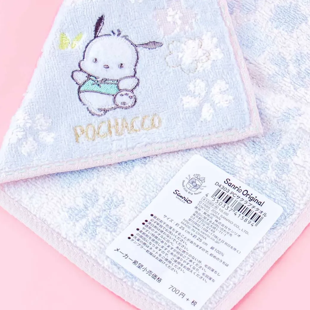 - A hand towel with embroidery featuring Pochacco and sakura flowers/li>