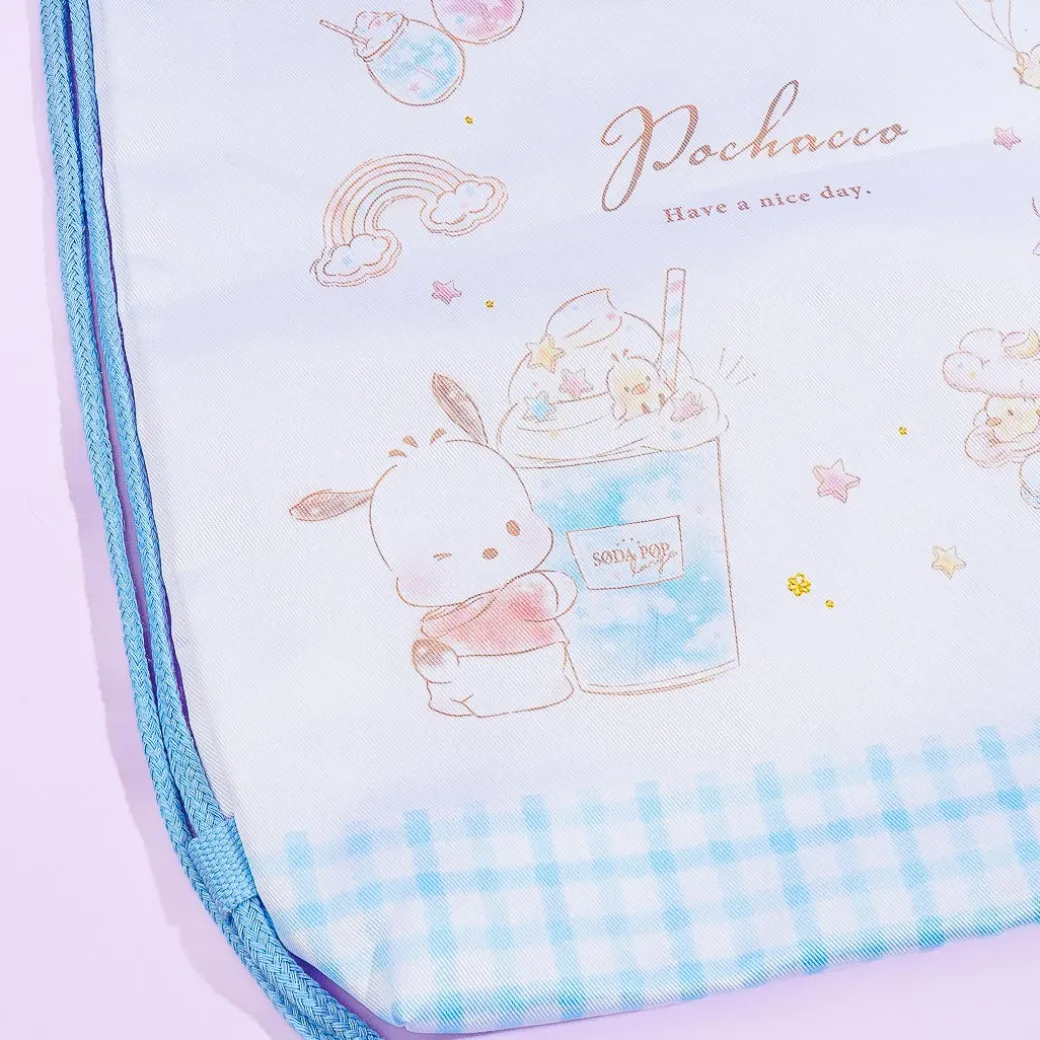 Carry your gym clothes or extra pair of slippers kawaii-style using this super cute bag! It features an illustration of Pochacco with a yummy-looking soda and other sweet treats. This bag features drawstrings and a handle so you can use it as a knapsack or as a handbag!