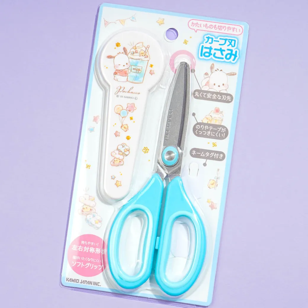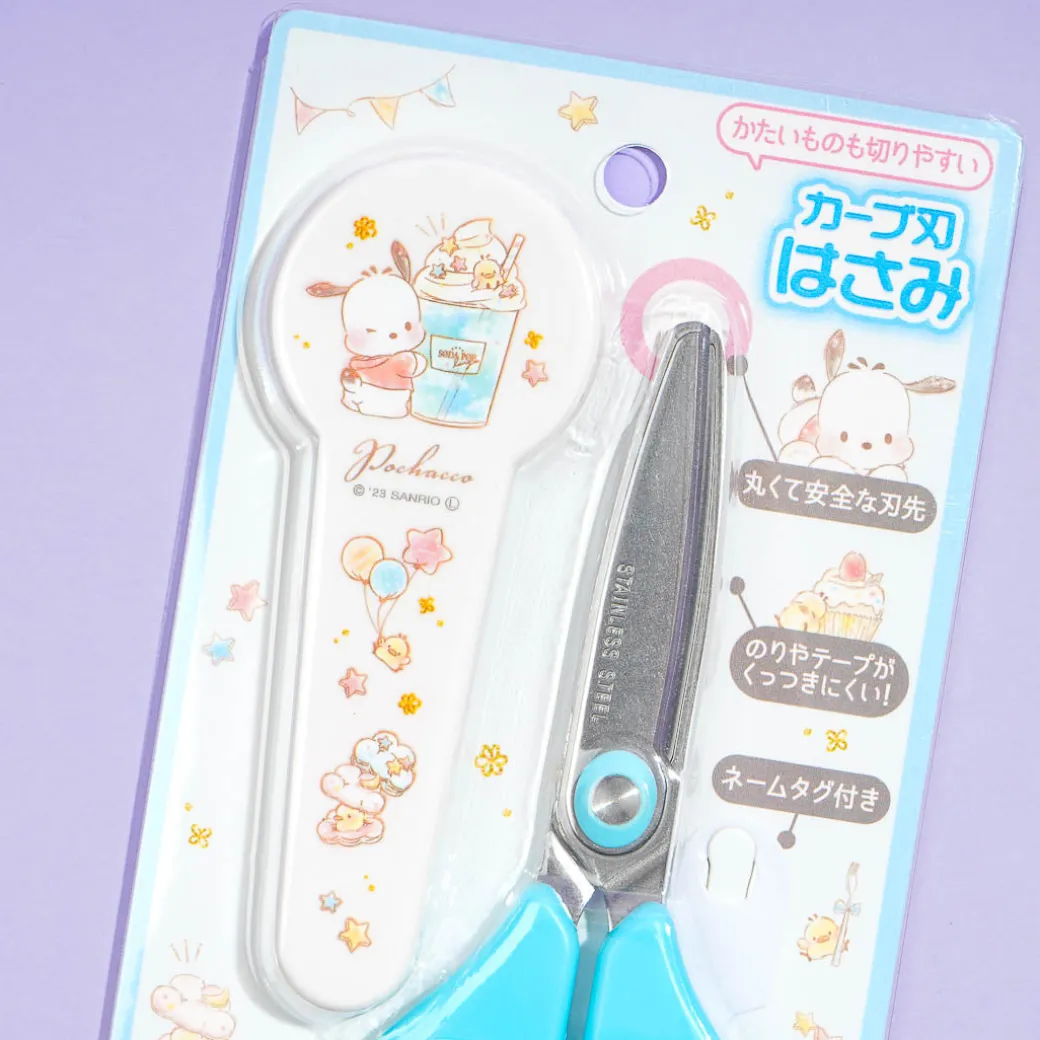 This pair of scissors features cute illustrations of Pochacco enjoying a soda pop! It comes with a safety cap for small children and curved blades for easy cutting. Use this for your art projects and don’t forget to write your name on the tag that comes with it!