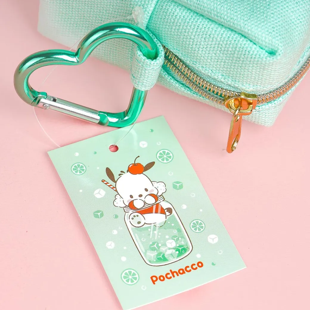 This cute square-shaped pouch has a transparent window illustrated with Pochacco inside a glass of soda. Use it to store all sorts of knick-knacks and trinkets! It has a zipper closure and heart-shaped carabiner.