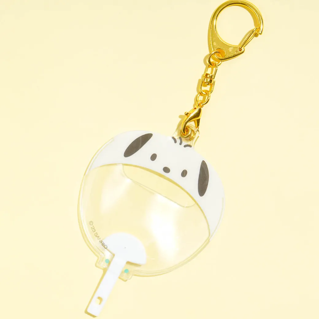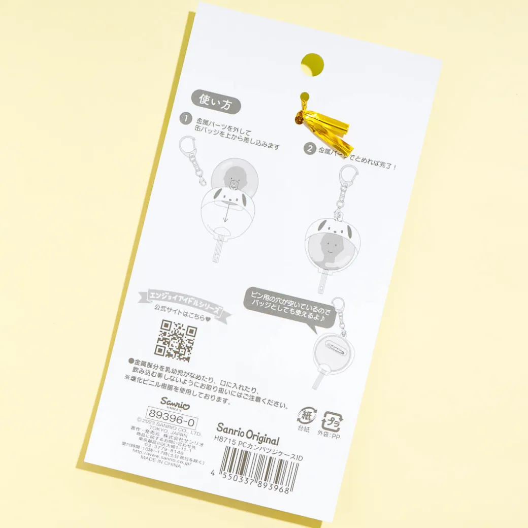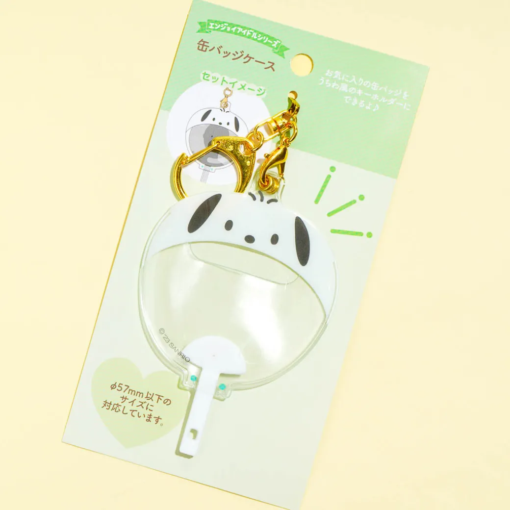 Spread kawaii vibes with this super cute clear badge case! It features Pochacco shaped like an uchiwa fan and comes with a removable metal hook that you can attach to your bag or keys. This case also has a hole at the back so you can still use your pin badge.