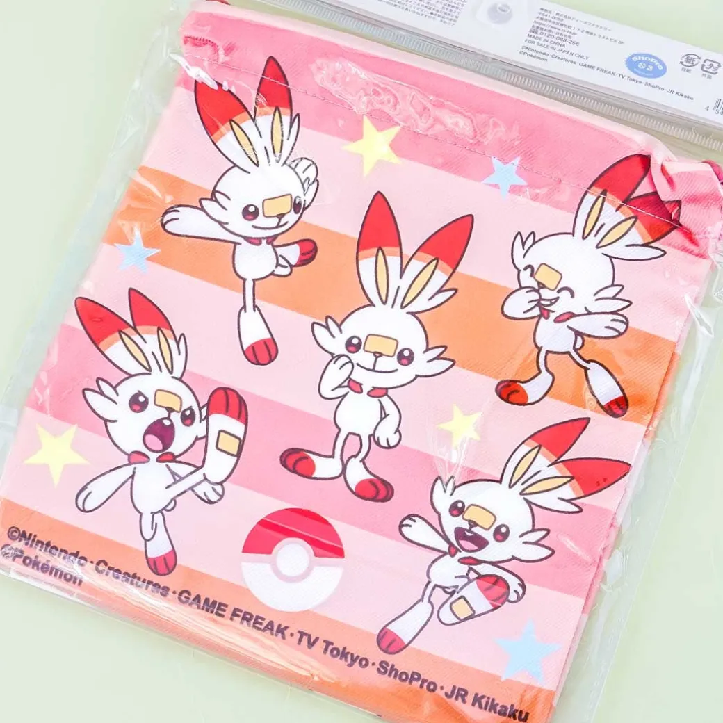 - A drawstring bag featuring prints of Hibanny, Poke Balls and stars