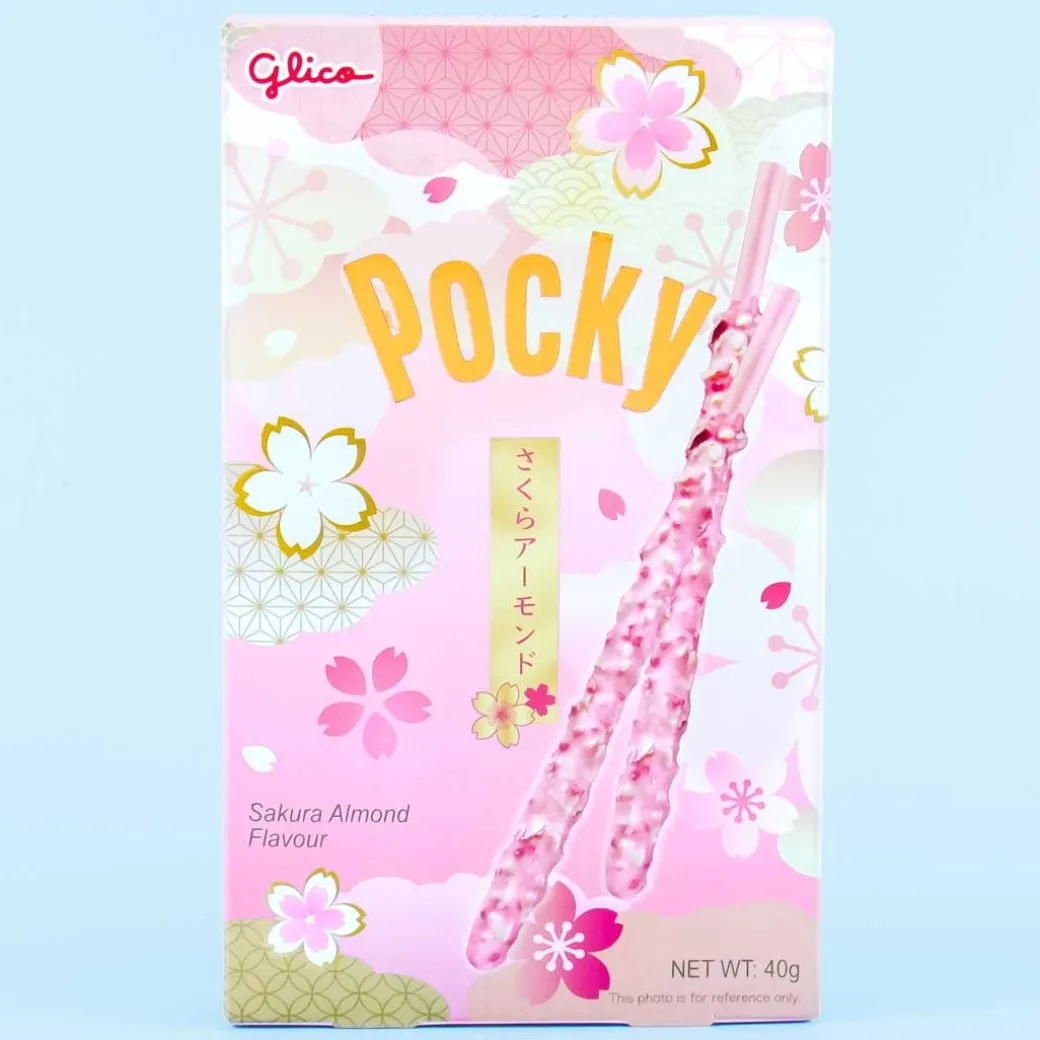 - A box of cherry blossom-flavored biscuit sticks covered with sakura chocolate and crushed almonds
