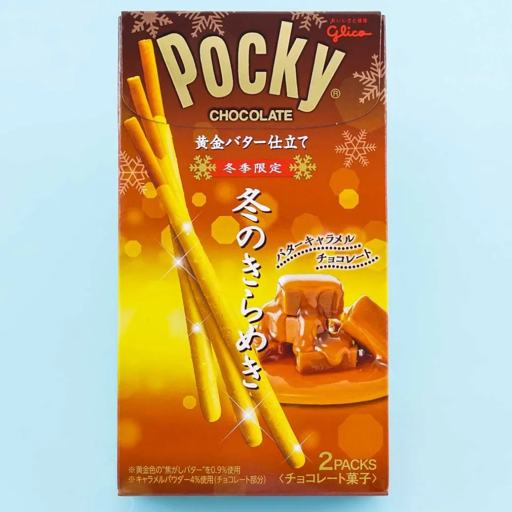 - A box of winter edition brown butter-flavored biscuit sticks coated with golden salted caramel chocolate
