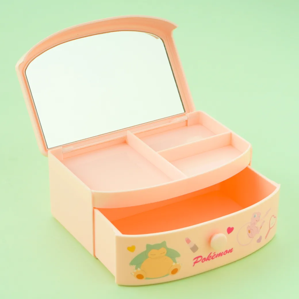 Keep your fave bracelets, rings, and other accessories inside this super cute jewelry box! It has a convenient single pull-out drawer and an upper tray with several partitions. This kawaii case is decorated with lots of hearts, makeup products, and popular Pokemon like Pikachu and Snorlax!