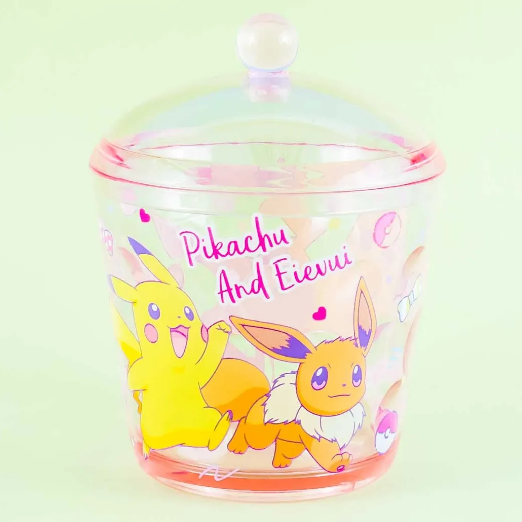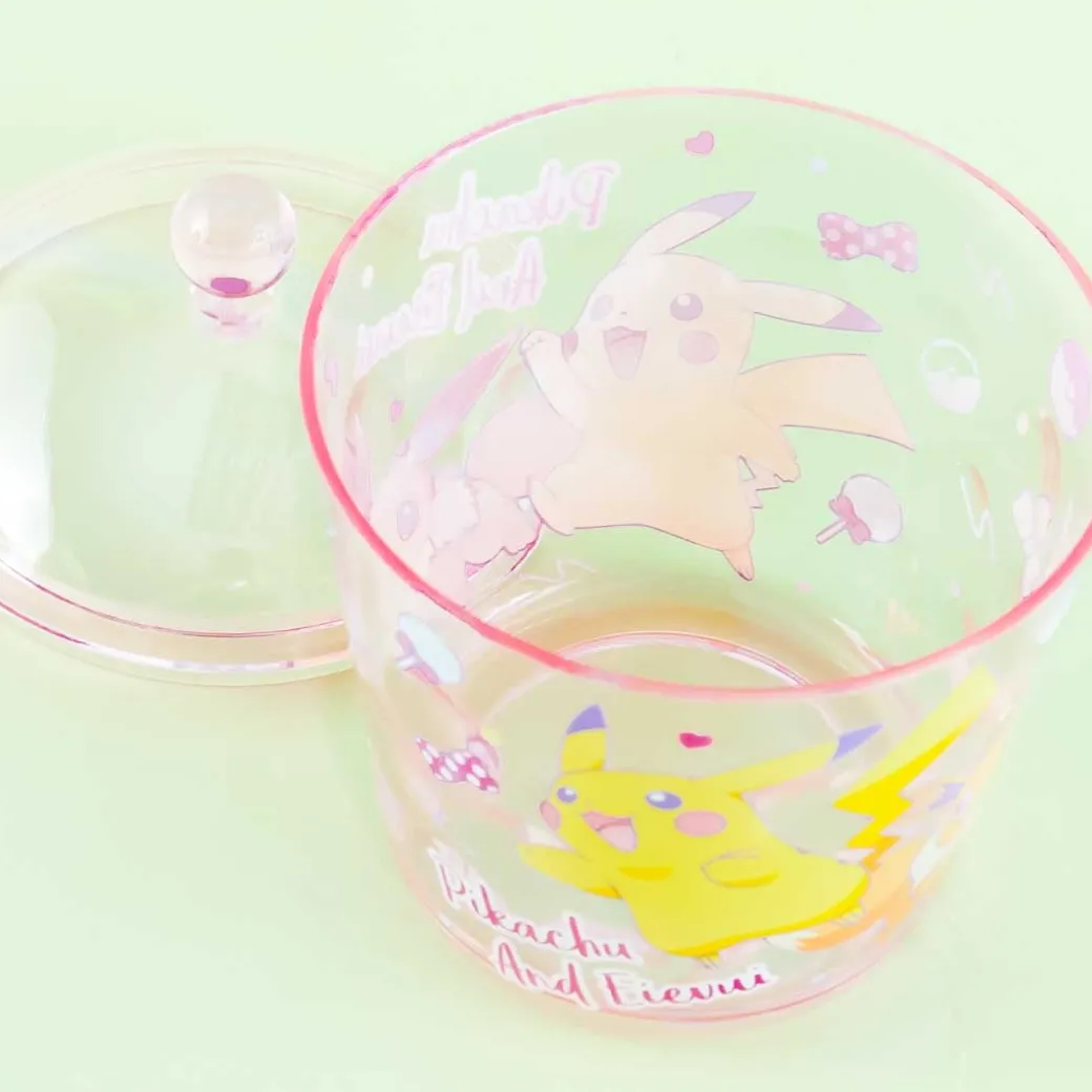 - A cute round transparent storage case featuring Pikachu and Eevee strolling together