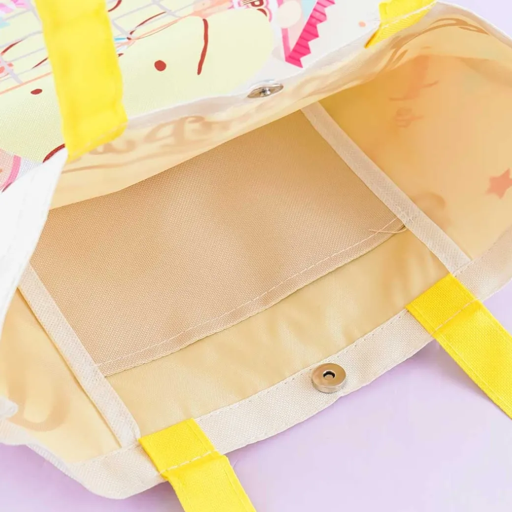 - A kawaii tote bag illustrated with Pompompurin inside a shopping cart with candy
