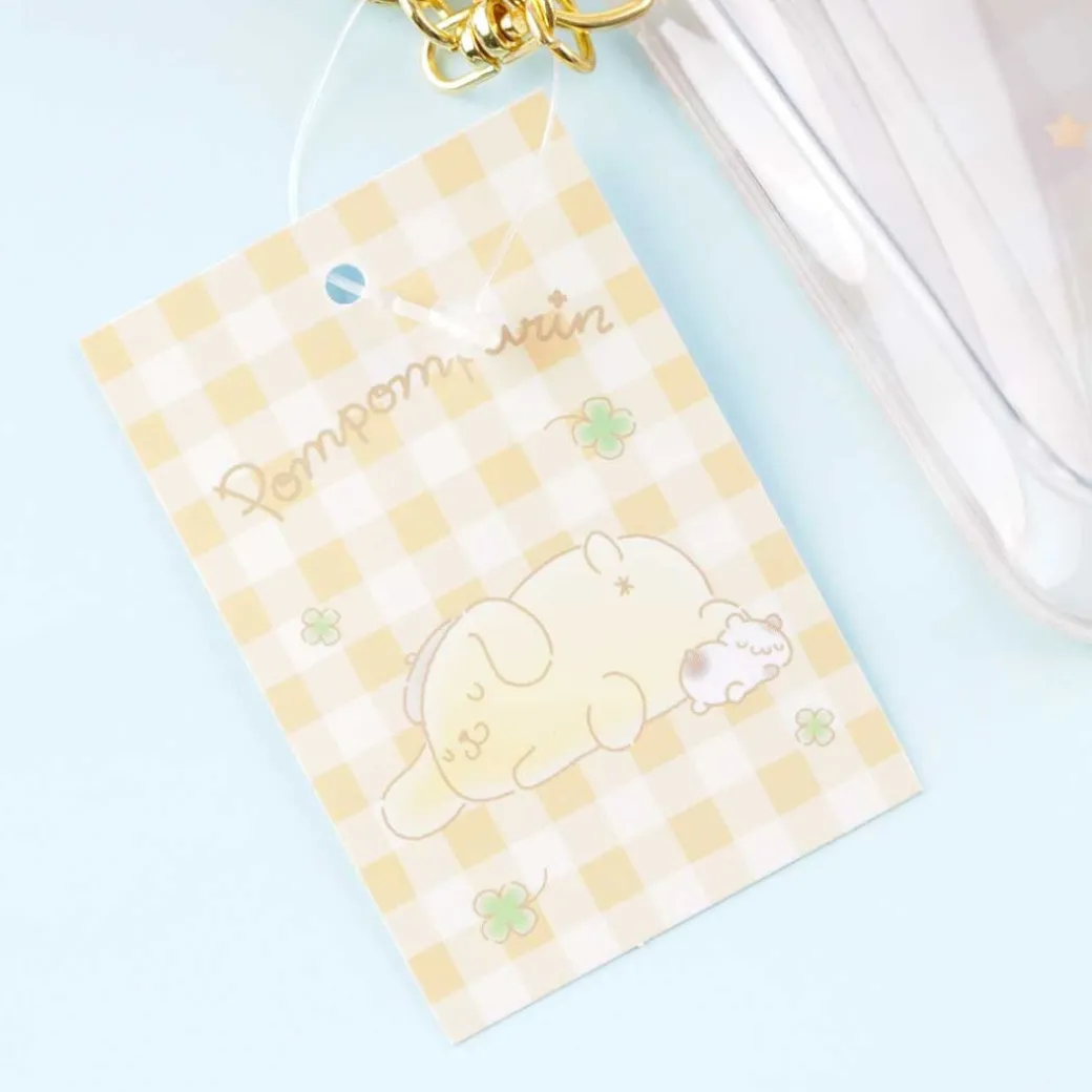 - A kawaii clear mini pouch illustrated with Pompompurin sitting among flowers