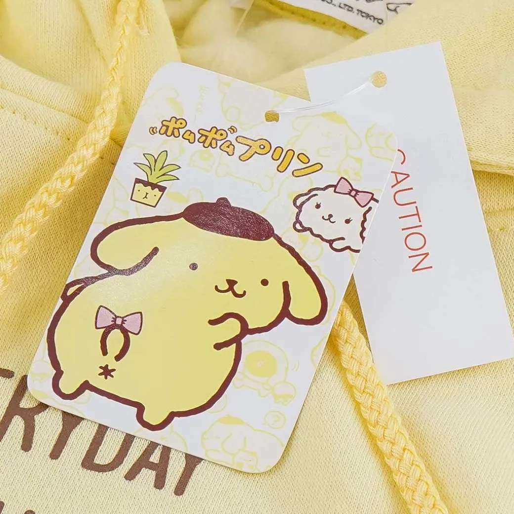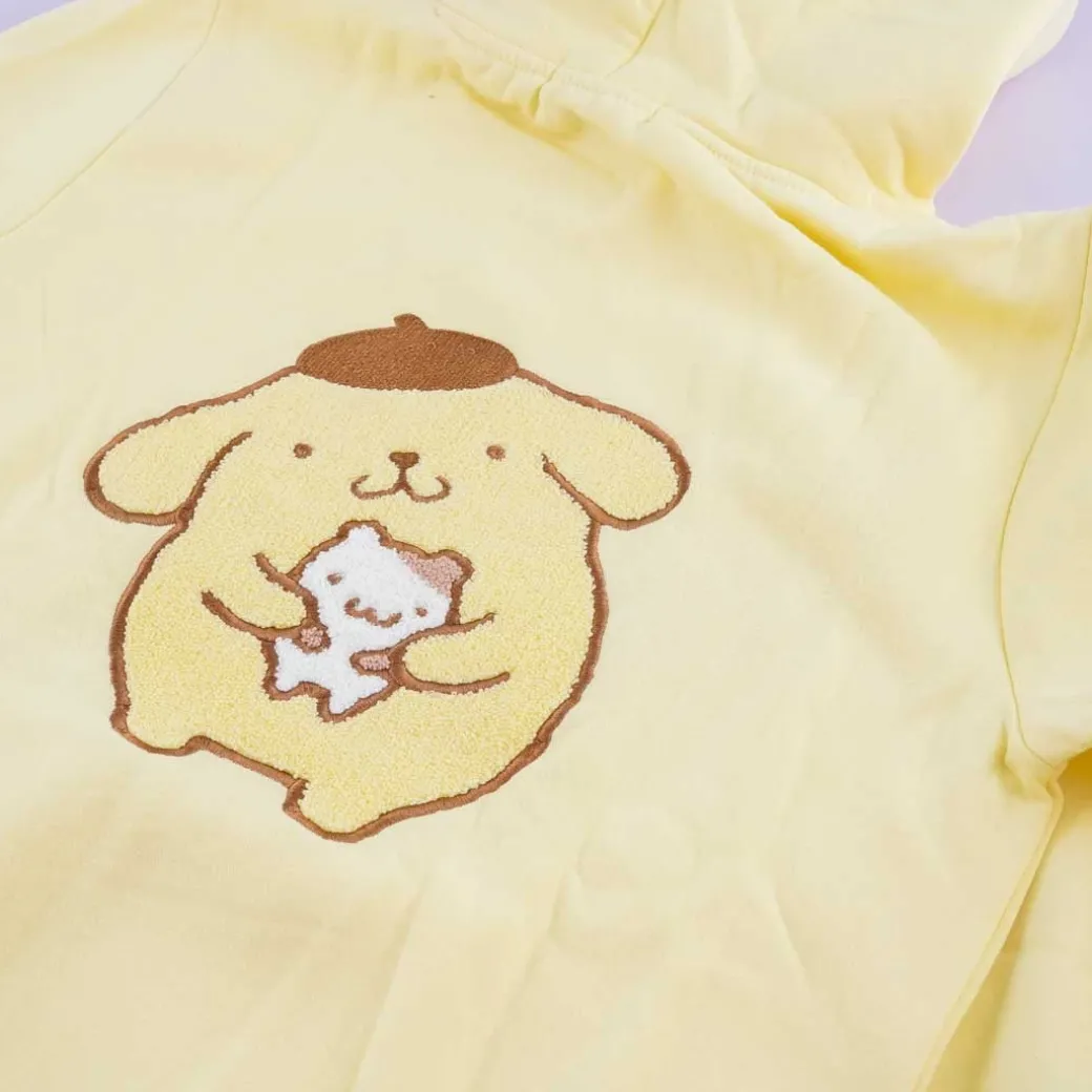 - A kawaii hoodie with embroidery of Pompompurin on its backside and a description of him on the front