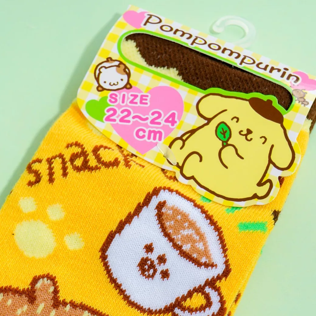 Kawaii-fy your outfit of the day by wearing these yellow jacquard socks! This super cute pair has colorful illustrations of Pompompurin having a fun break with coffee and donuts!