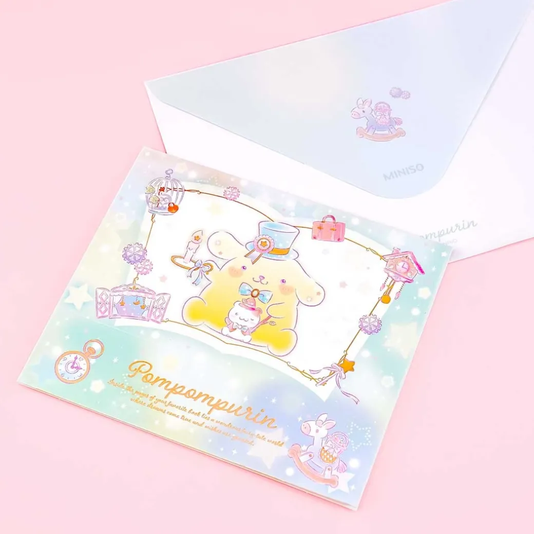 - A super kawaii pop-up greeting card featuring prints of Pompompurin in a fantasy land
