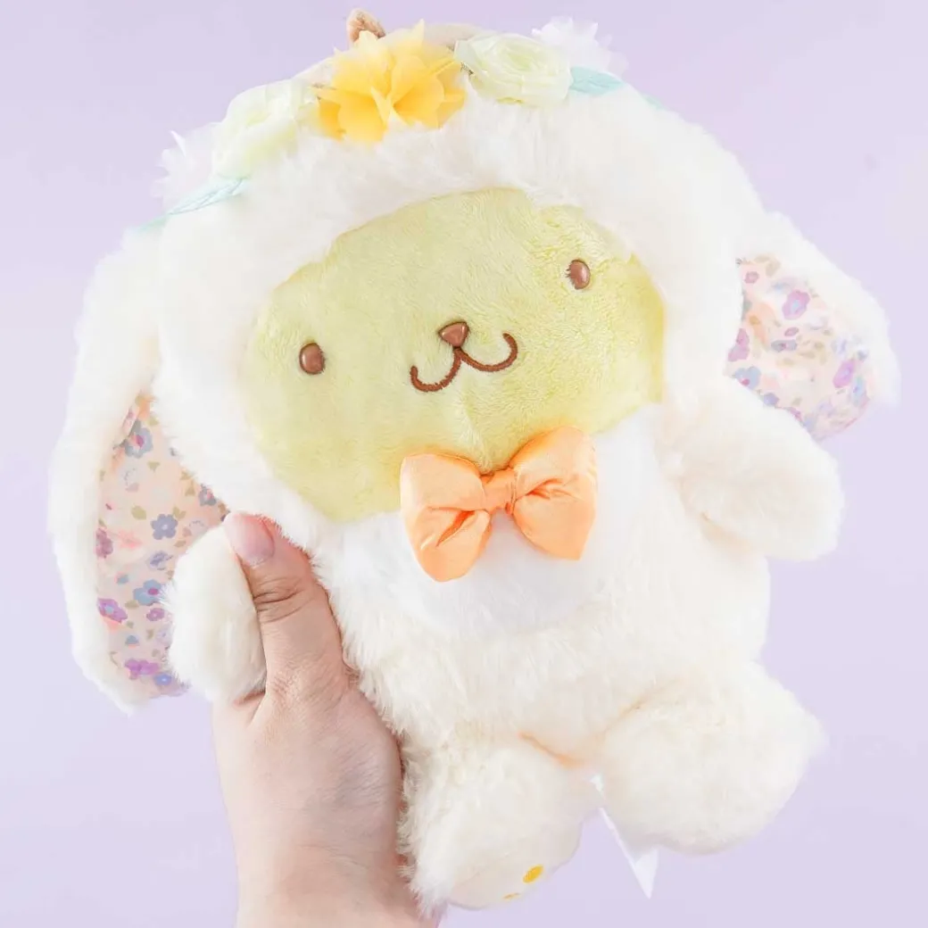 - A cute medium-sized Pompompurin plushie wearing a flowery bunny outfit