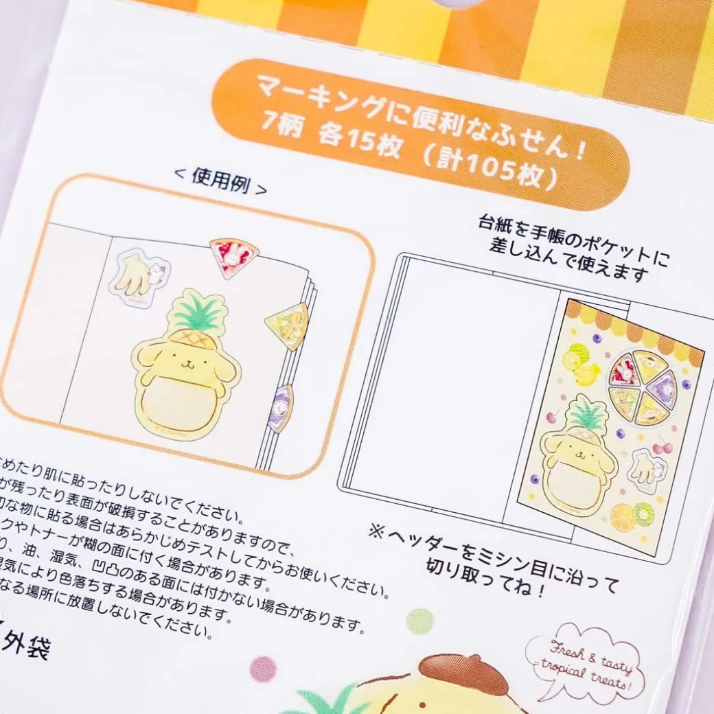 - A kawaii set of sticky note tabs with prints of Pompompurin, fruit pie slices, and fruits