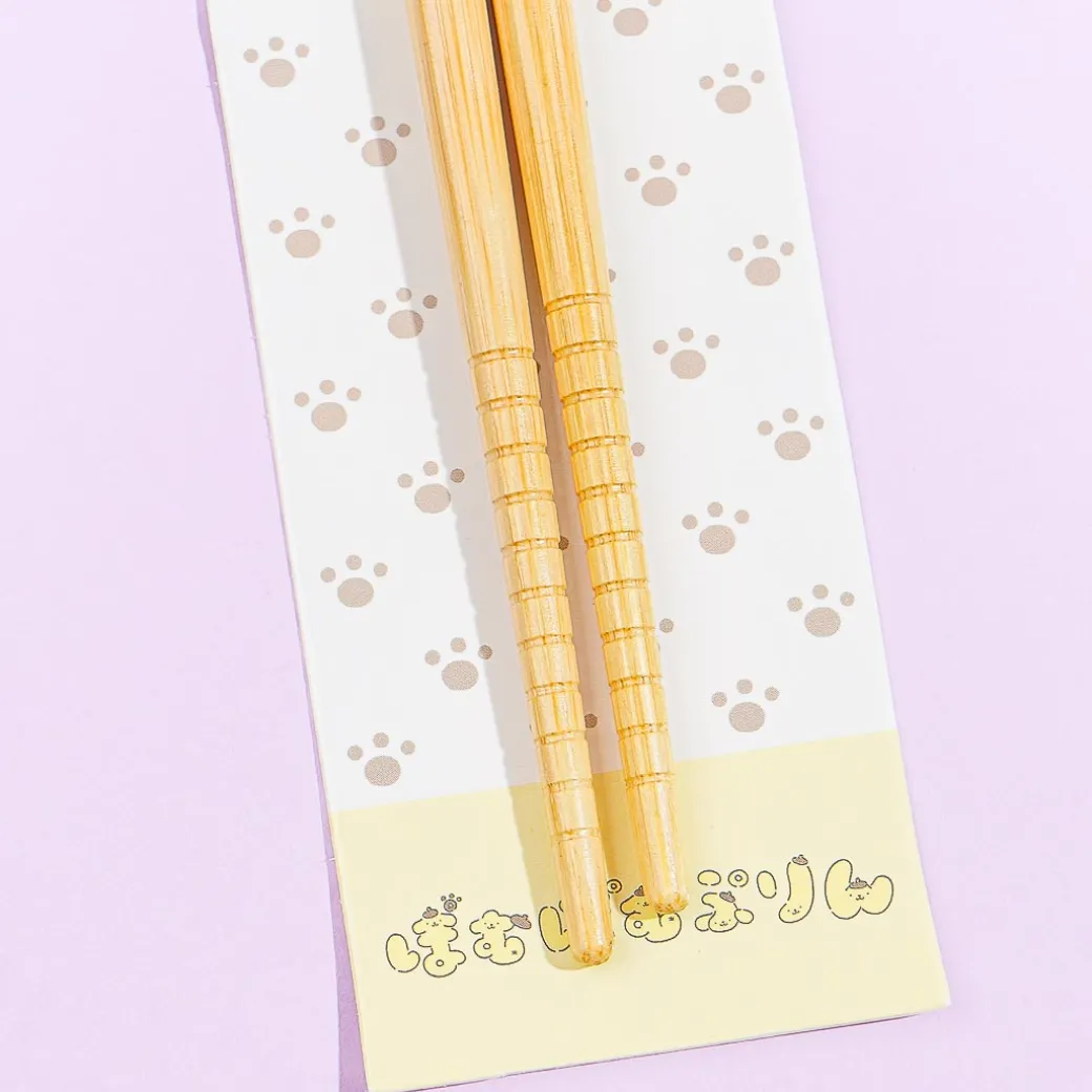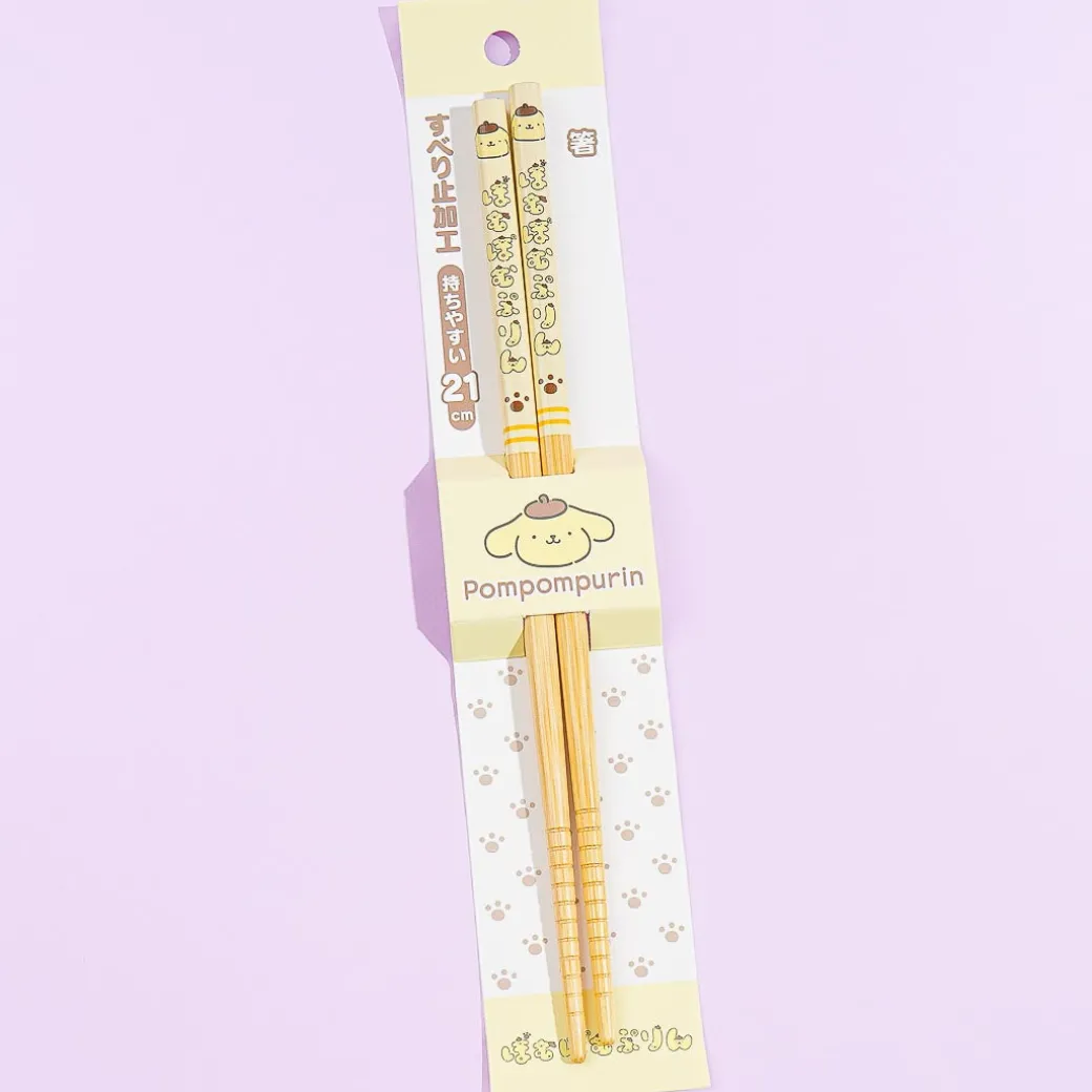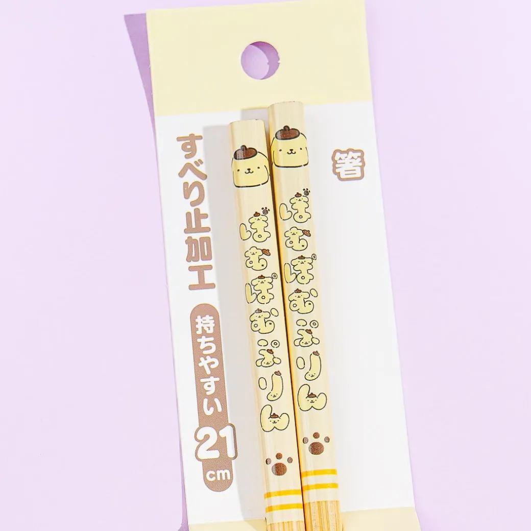 Bring this kawaii pair with your bento box to school or work! It’s made of reusable bamboo, has non-slip tips, and has cute illustrations of Pompompurin shaped into Hiragana characters that spell out his name.