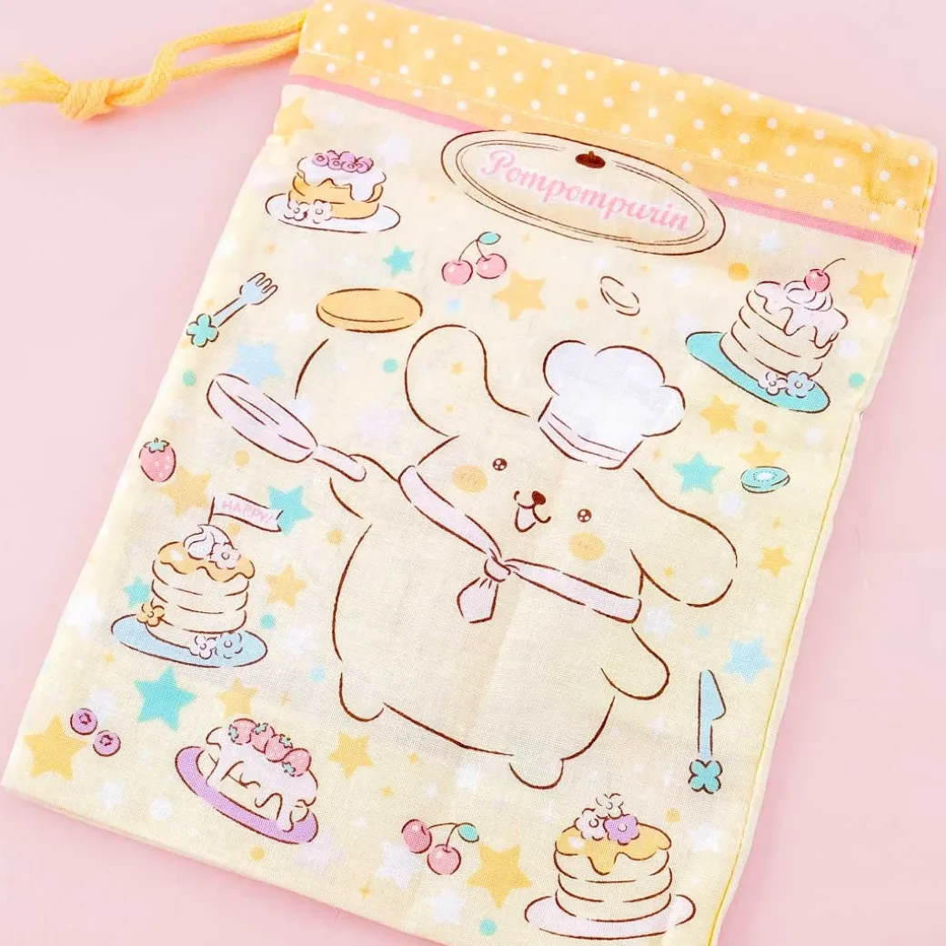 - A kawaii drawstring cotton pouch featuring prints of Pompompurin and pancakes